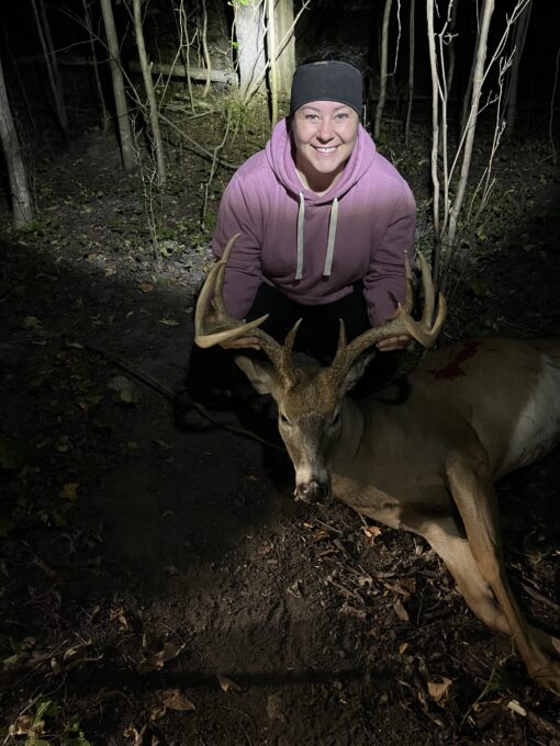 He came out in the corner of the food plot, slowly fed in to about 35 yards, and the rest is history! We watched him stumble a bit, and then heard him crash just out of sight. It was an awesome hunt with lots of memories, and my husband was able to share it with me!