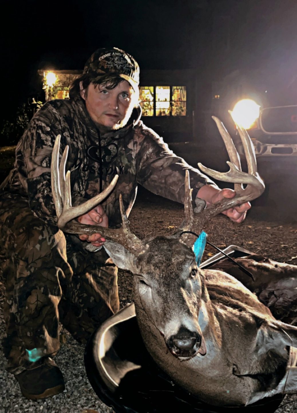 Non stop action all morning but the deer were mostly out of range. At noon I regrouped and moved closer to the runs. Making a makeshift blind in a fallen tree. Not even 5 minutes after sitting down, here came a doe with the big buck hot on her trail. Unfortunately I had shot my bow after my hunt and had not yet re-cocked it. I knew I had to do just that when they were behind some trees and thick brush. Luckily I was able to cock the crossbow and set up just seconds before he was in range. I made a 40 yard shot and he ran about 75 yards and piled up. I green scored him in the low 150’s