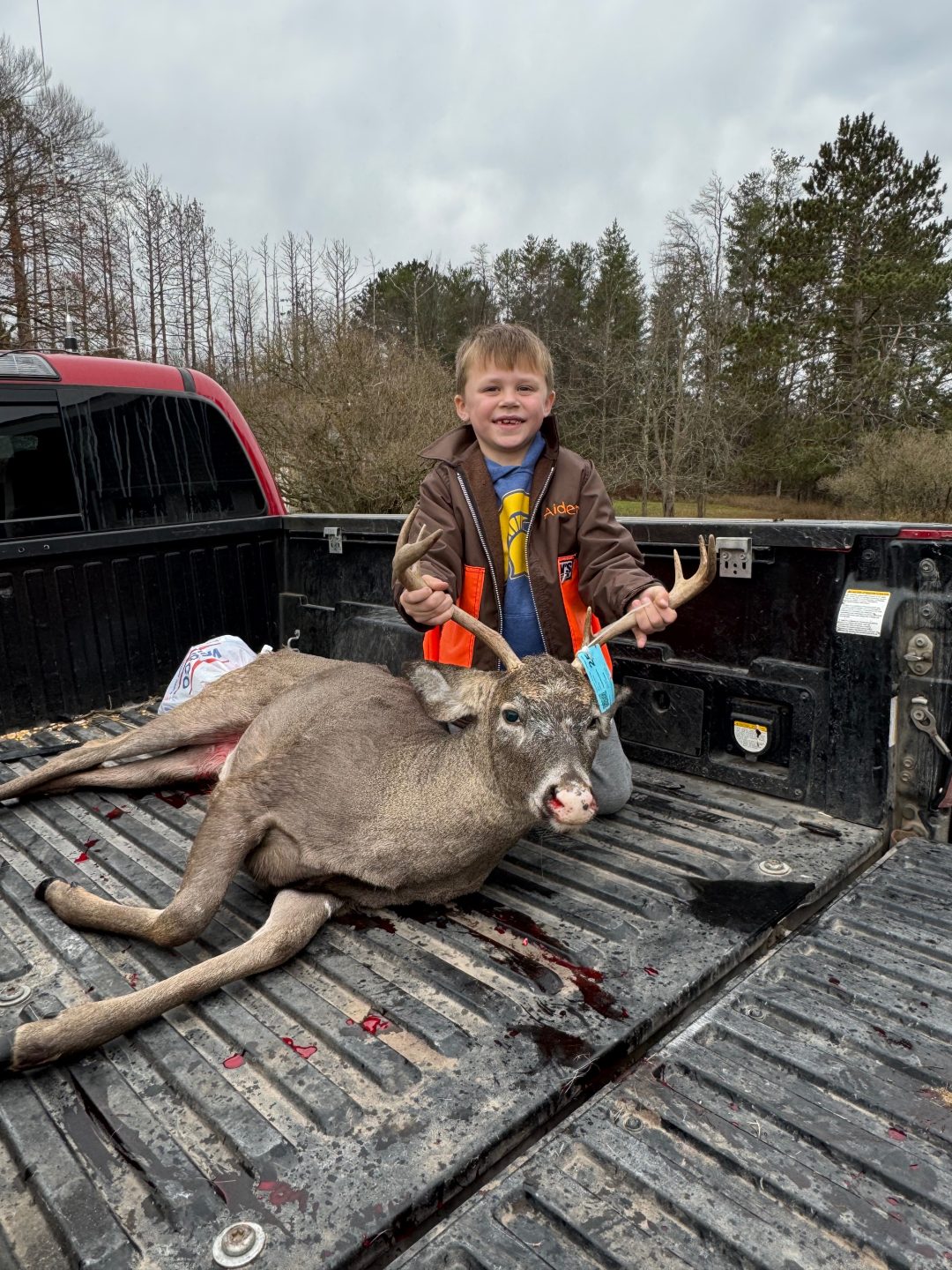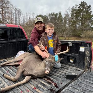 My dad I got in blind nice early when got daylight deer started moving around 7:50 dad taps me on shoulder says get over here he gets window open gets my ear muffs on watched this buck for half hour till dad said he’s close enough when he’s broadside and your ready pull the trigger I said I’m ready pulled trigger and he dropped my first deer ever my dad and I started jumping around in blind high fiveing and he game biggest hug said I’m so so proud bud