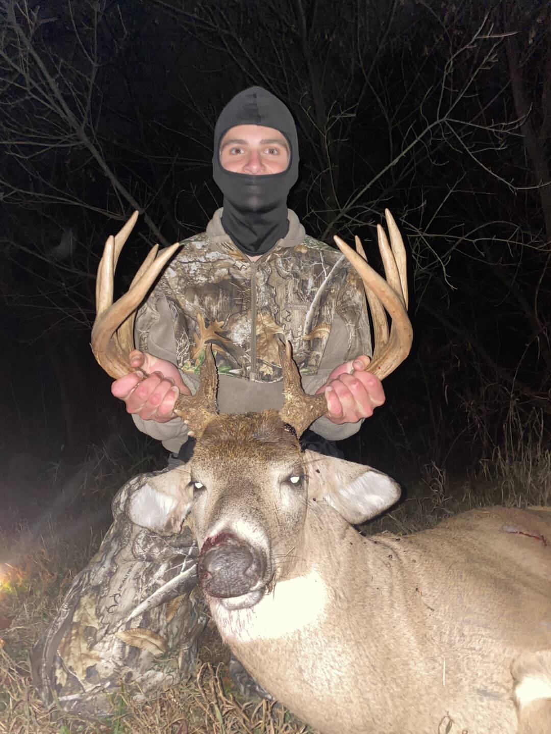 I heard some grunting back in the woods at first so I wasn’t to sure how big this deer was going to be. The woods went quiet for about 3 minutes then this guy, my target buck came out of the woods with his chest all puffed up looking at these 4 doe. He walked about 30 yards away from me and it was barbecue chicken from there.
