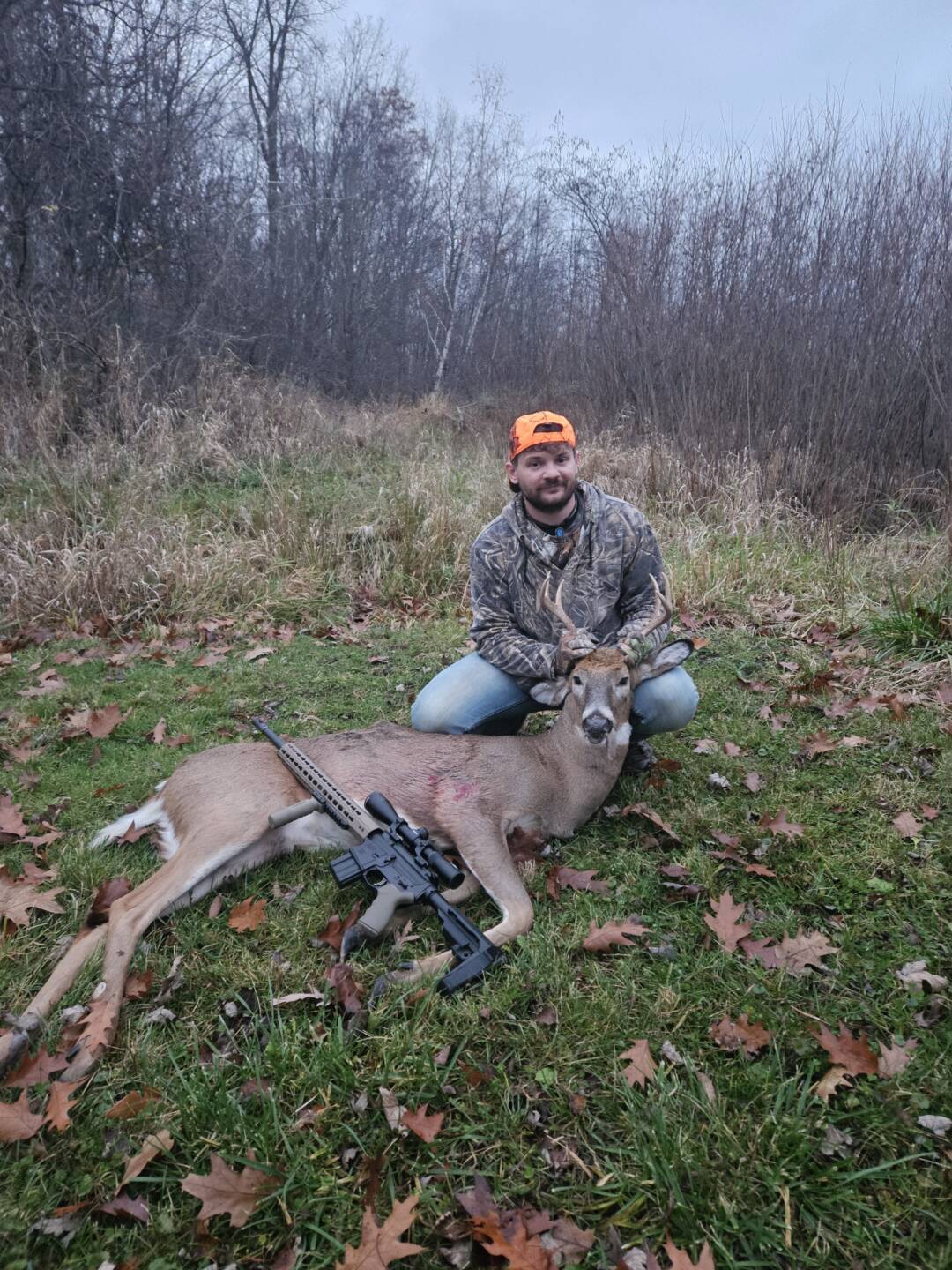 My little brothers first deer. He was sitting in his stand for a couple hours and seen him come around 430 pm. Took him with his 450 bushmaster. He got the heart and double lunged him. He went about 20 yards and dropped.