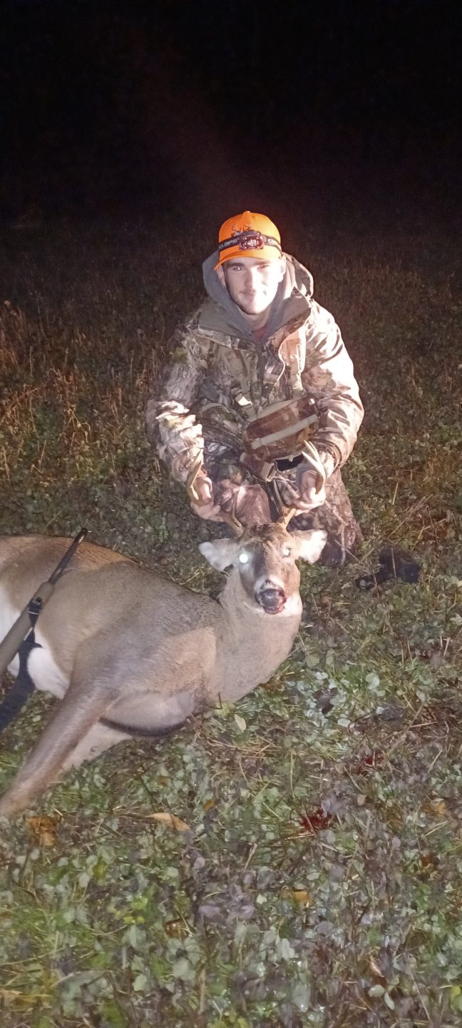 at 5 oclock I had a few deer in this dead wheat field that has cover seeded over it and a pack of bucks come out of the neighbors woods 500 yards out and they were chasing a few doe the neighbor shot the doe and I lost the buck after that I moved to this other window since I see deer running and moved my dial to 150 yards on my ruger 350 and I pick my head up and here the 8 point 88 yards from me in the neighbors field I texted him for quick if I could shot this buck and he said I could so I moved back to the other window ranger him at 82 yards set ny dial for hunt yards made sure the neighbor dragging his doe wasn’t in my line of fire and I click that safety and pull the trigger on the buck he did a donkey key and ran and died at the fence to my property. Made the easy tracking job.