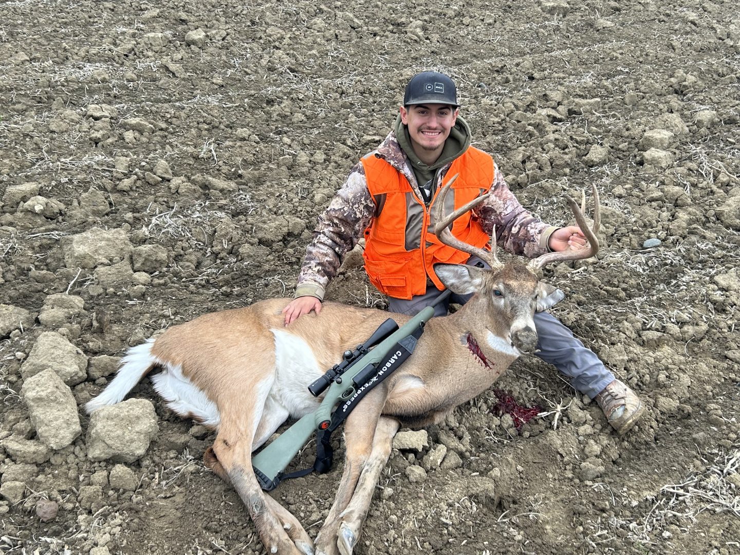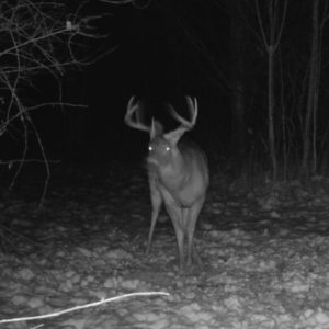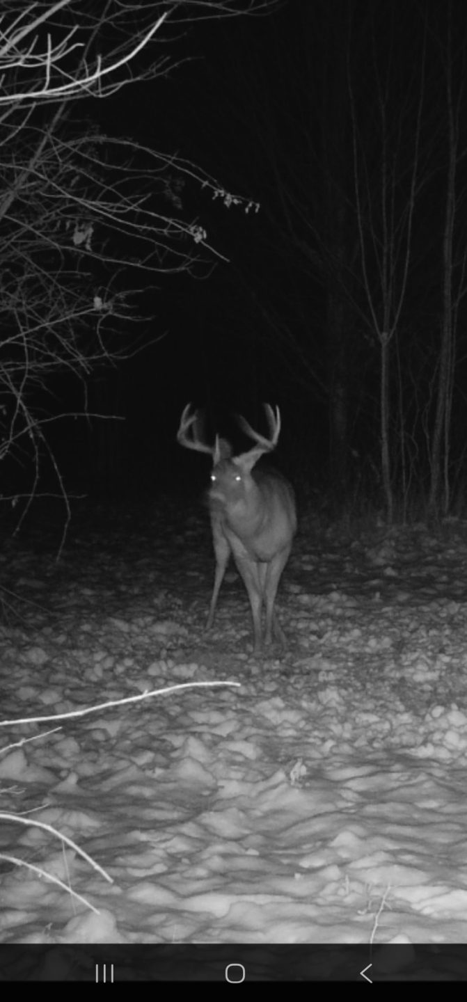 My dad shot a buck around 7:20 and we both decided to wait around 9:30 to go look for it so when 9:30 came around I got out of the blind and looked in a field behind me to see if the deer was there and I came back to the right side of the blind and I see this doe running so I stop so it doesn’t see me and I look to the left a little bit and he’s chasing the doe so I put my back up against the side of the blind and I yelled to get to him to stop so he paused and I took the shot. My intended target was behind the shoulder but I had nothing to rest on so I got lucky with the shot by hitting the neck and dropping it. He was also caught on somebody’s camera at 2am of opening morning a couple miles down the road.