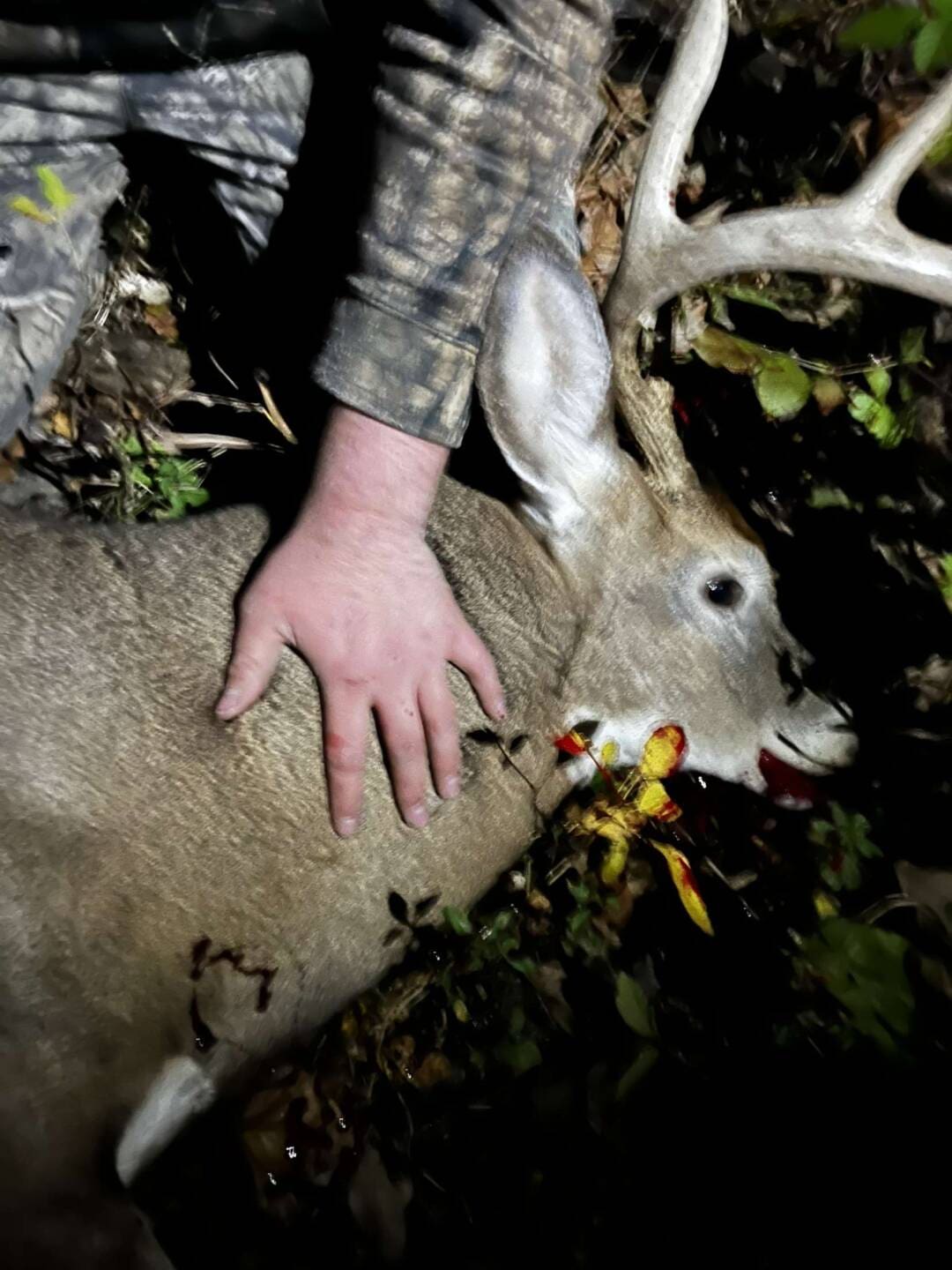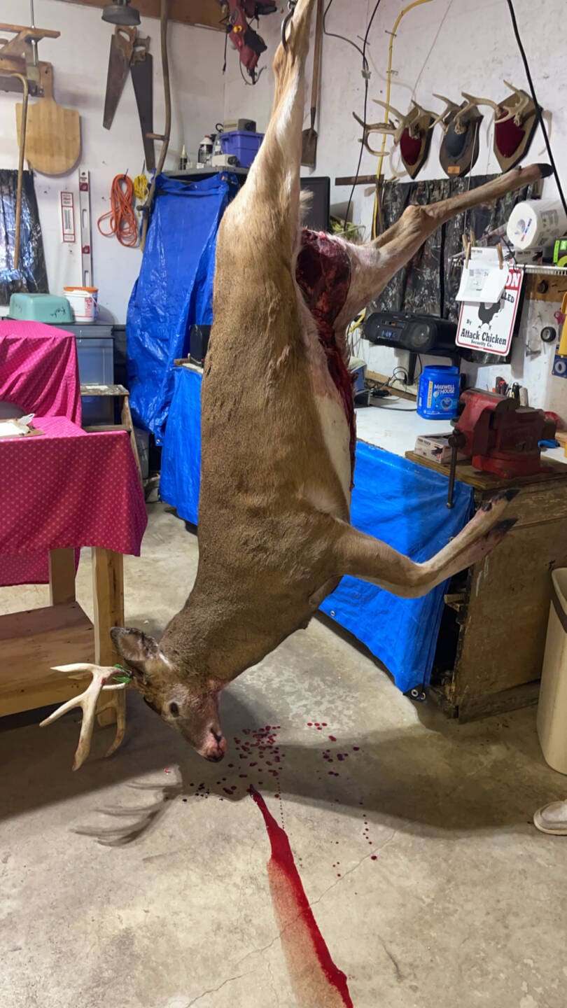 Got the saddle up in the tree was pulling my line up I spooked him I grabbed a quick video of him running off got my stuff all set back up about 30 minutes later he comes back out I draw back at 30 he walks right tthrough my shooting hole right to 8 yards
