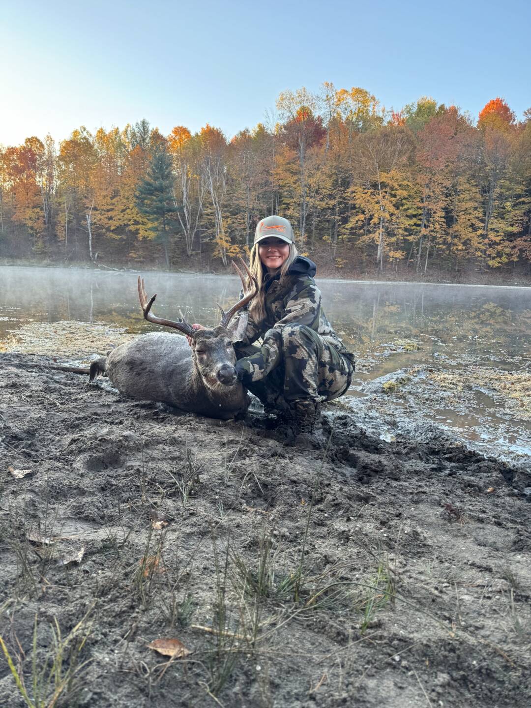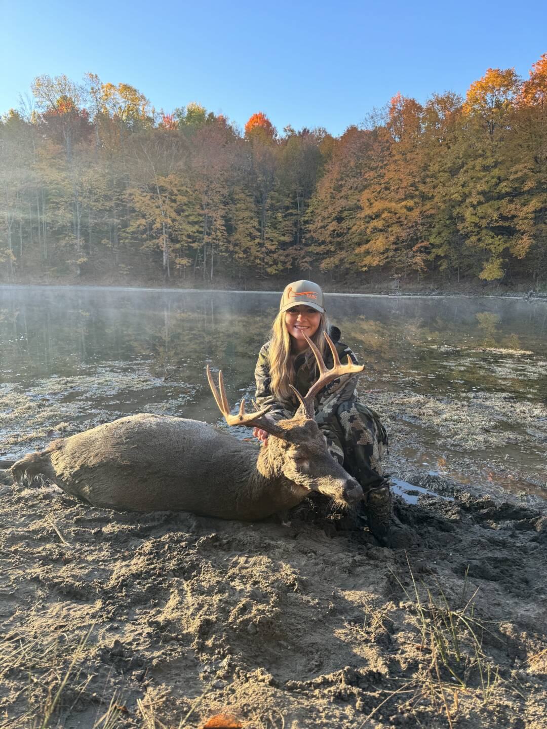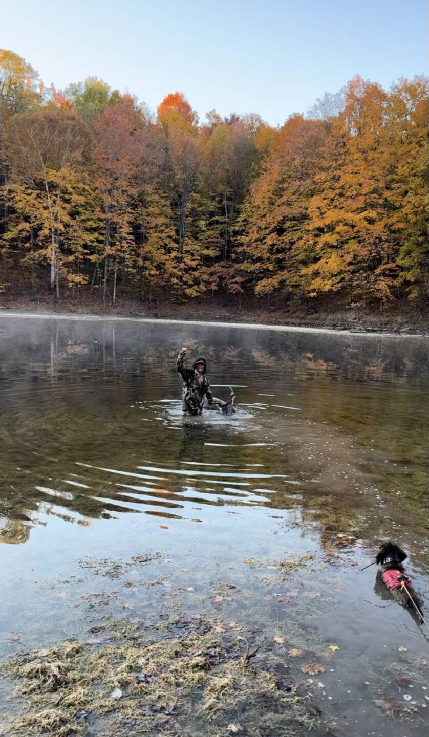 Does all evening until this big 10 we haven’t seen since early September stepped into the food plot. He was quartered at me for some time, and finally gave me a broadside shot. Let the arrow fly around 6:30pm when he finally gave me the opportunity at 36 yards. Let him sit and then went to track. We tracked for about 45 minutes with very little blood. We came up on a spot where he must have bedded down and we’re thinking we jumped him. We decided to let him sit and go back in the morning. We called a dog for the next morning and we were able to find him in the pond! What a fun experience!