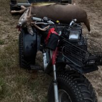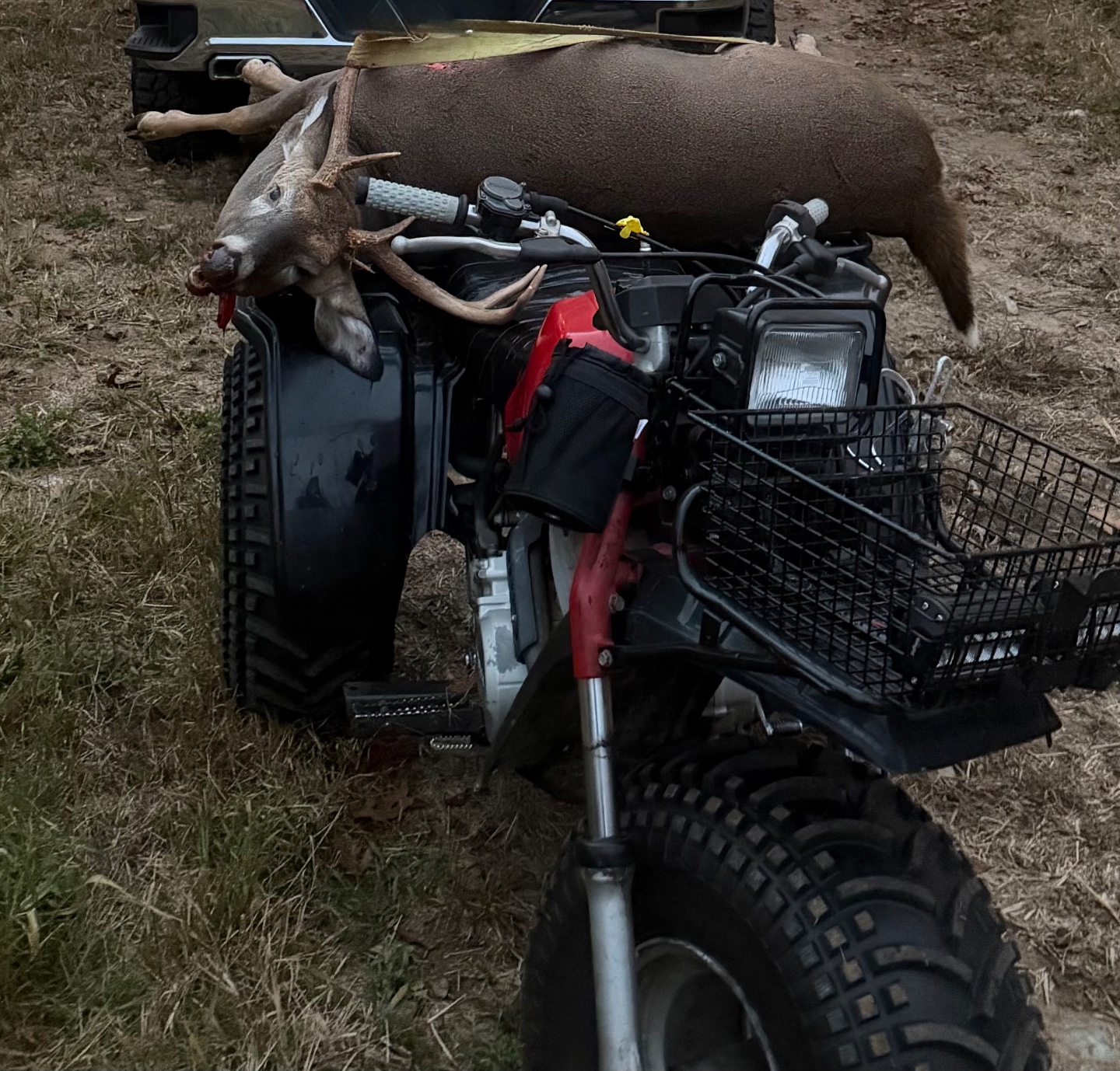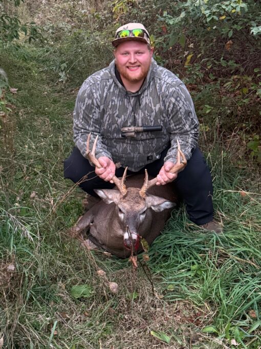Haven’t seen him on camera since 1st week of August until this morning while I was at work…. so I went out after work and sat for a hour and a little baby buck came out. Could only see the nubs where his horns should be then here comes big papa. Behind me and to the left. When he stood up on his back legs to eat some mulberries I turned around and pulled up, lined up then shot as soon as his front feet hit the ground. Ran 60-65 yards and dropped dead. Straight through the heart! ♥️