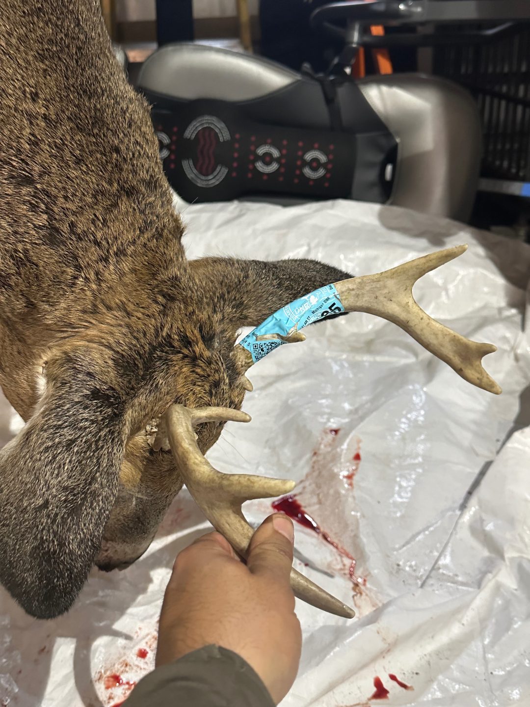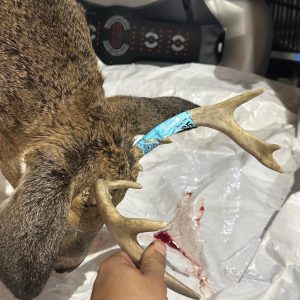 He came in early morning just as the sun was coming up and he was out in the field I saw him on the corner of my eye and took a shot at him it went clean through him with a lung shot and then my broad head broke off I got down after an hour half goes by went to go look for him and couldn’t find him so I called in a tracker to help me find him and he said he would come by and help me find him with his dog and they found him in my neighborhoods other corn field as the buck was still alive and took him a good 15 mins to die