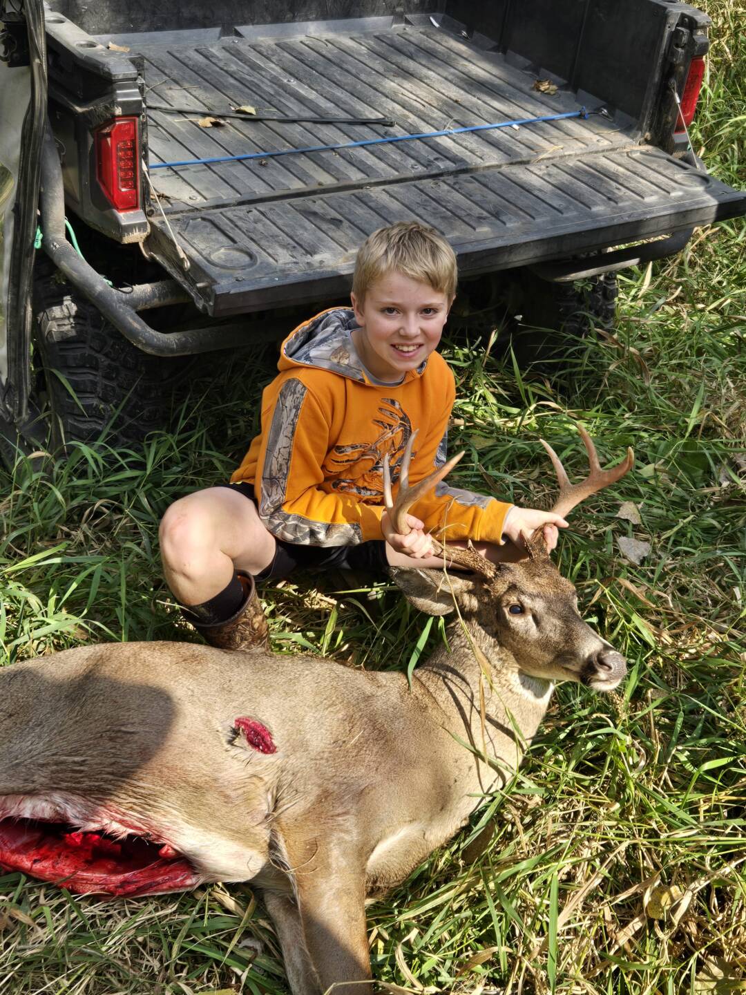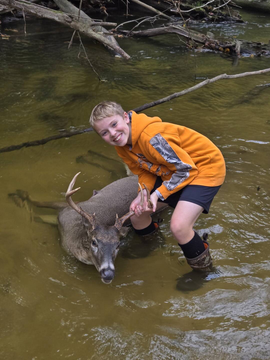 Saw a group of deer working in through the brush. All 4 were bucks. Waited till the biggest gave me a clean shot which felt like forever. After the shot waited 2hrs before we tracked. Found him expired in the creek. Happy would be an understatement. Second buck ever at 11 years old