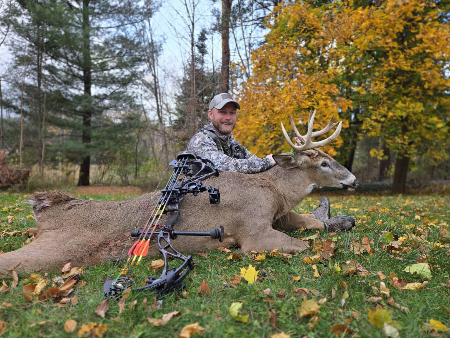 Based on previous years data, I always have mature buck movement on October 30th. So despite the 77 degree weather, I did a hang and hunt in a pinch point between a cut ag field and a river. 30 minutes before dark, he worked his way along a brush line and up to the river. He then followed the river towards me. He was about to cross the river at 44 yards, so I drew, settled my pin, and sent it. I made a perfect quartering away, double lung shot and he piled up after about 100 yards. He’s my personal best.