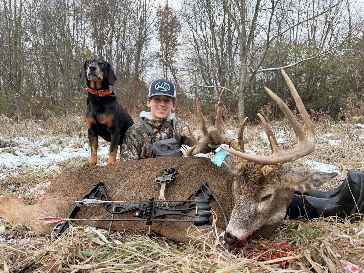 I headed out after school on snowy Monday afternoon. When I first got setup I had several young bucks moving in the brush all around me. They knew I was there but wouldn’t leave. My dad text me there a mature deer must have a doe upwind in the bedding area. Sure enough around 5pm the doe ran out of the bedding area and the big 10pt was close behind. I shot him at 20 yards right in the middle of the body. We gave him overnight as my dad called Rob Miller deer tracking to come help on Tuesday morning. There was no blood but that didn’t matter to Sargent, he ran right to my buck. After a couple follow-up shots the buck was down! A Veterans Day hunt I will never forget.
