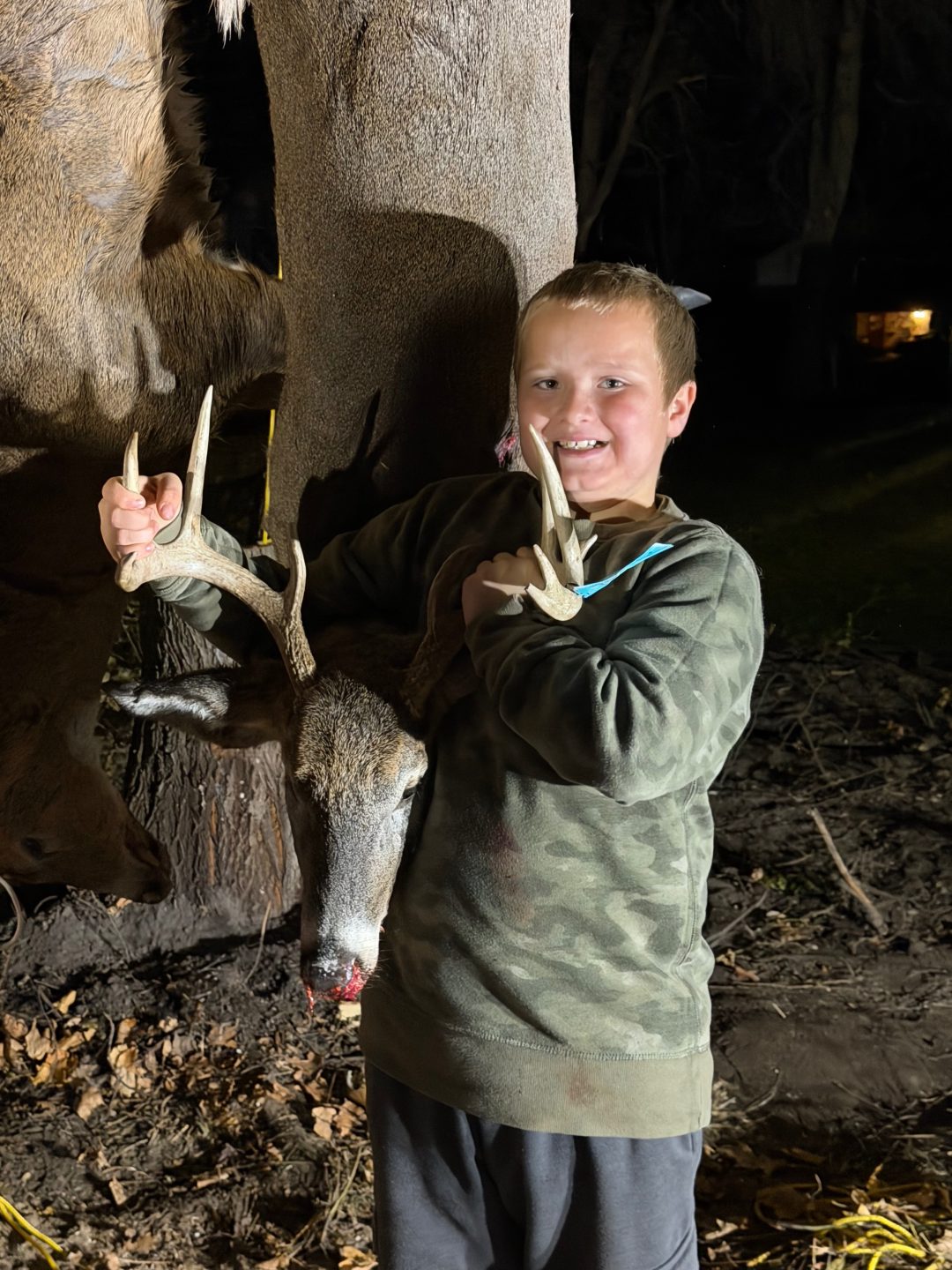 While sitting all day, opening day, with my 8 yr old son, Bentley. We passed up a few smaller bucks. Enjoying the day. When at 4:30pm this guy came out of the thicket. The boy was ready next to me so I said told him “take the gun and kill him”. With my 450 Bushmaster, at 40 yards, he dropped him with one shot.!