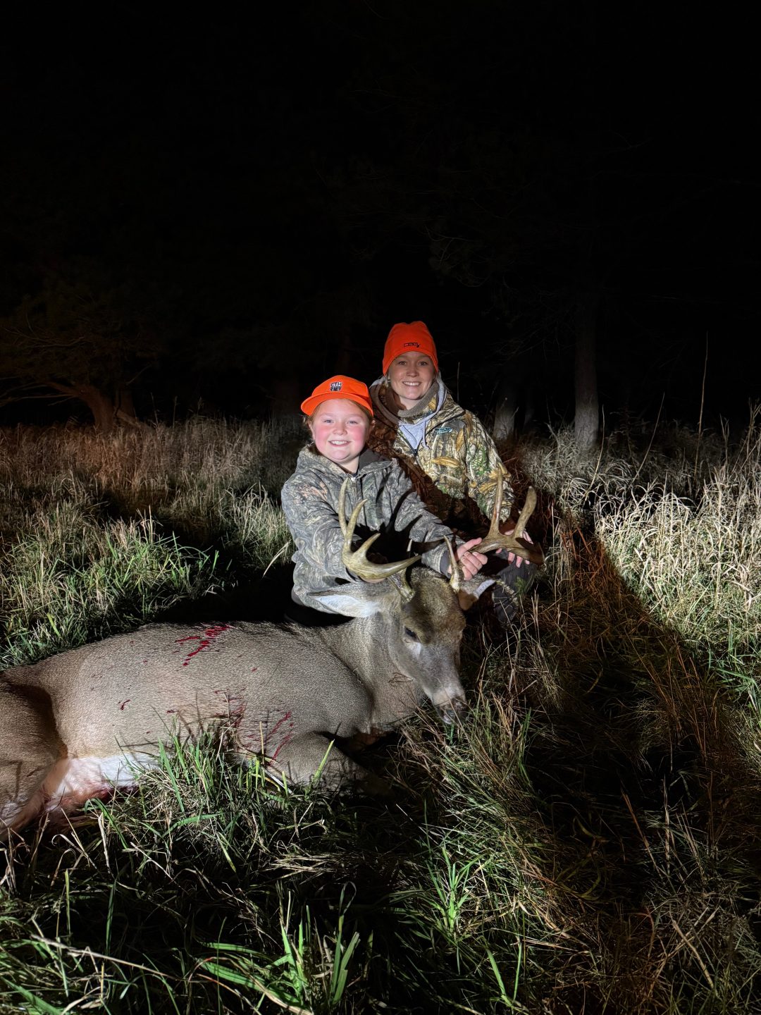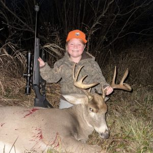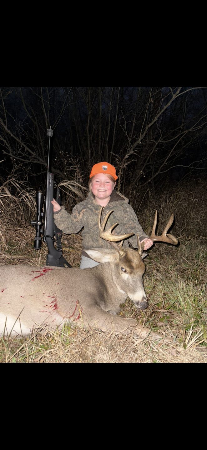 Hi! I’m braelyn I’m 9 years old this is my biggest buck, we seen this buck chasing a doe in the tag alders and the doe came running as fast as she could through a lane so my dad told me to get my gun in the lane this is going to happen fast he stepped out and I dropped him right in his tracks