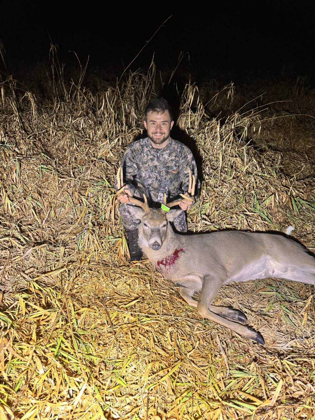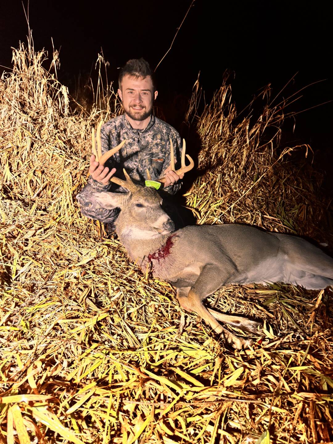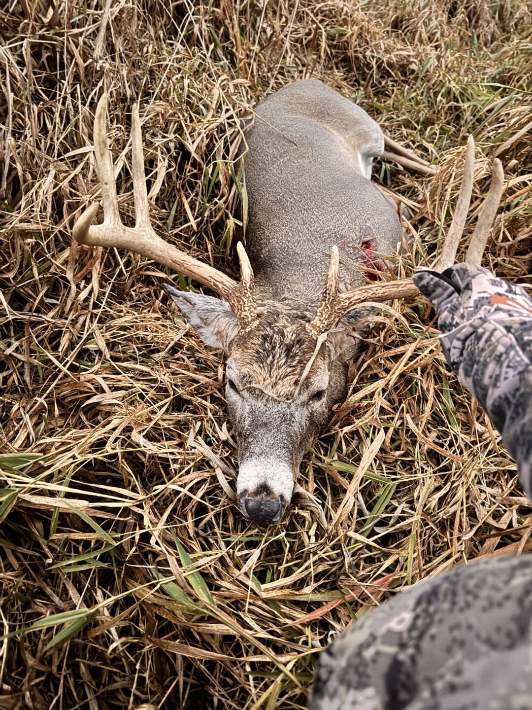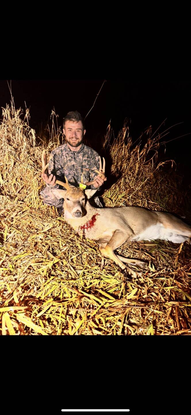 Had not seen a deer all day and around 5pm looked up and to my left and he was standing about 85 yards from me looking straight at me. I’m not sure if he saw my head movement but he stared at me for what felt like eternity but was around 2 minutes. I thought it was a doe until he stopped staring at me and started walking again. I then saw his antlers and slowly grabbed my gun and rested it on my stand. Shot and dropped him where he stood.