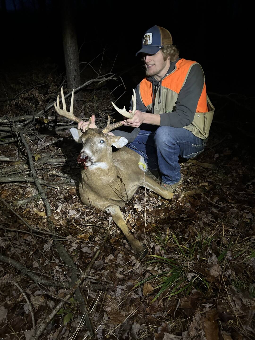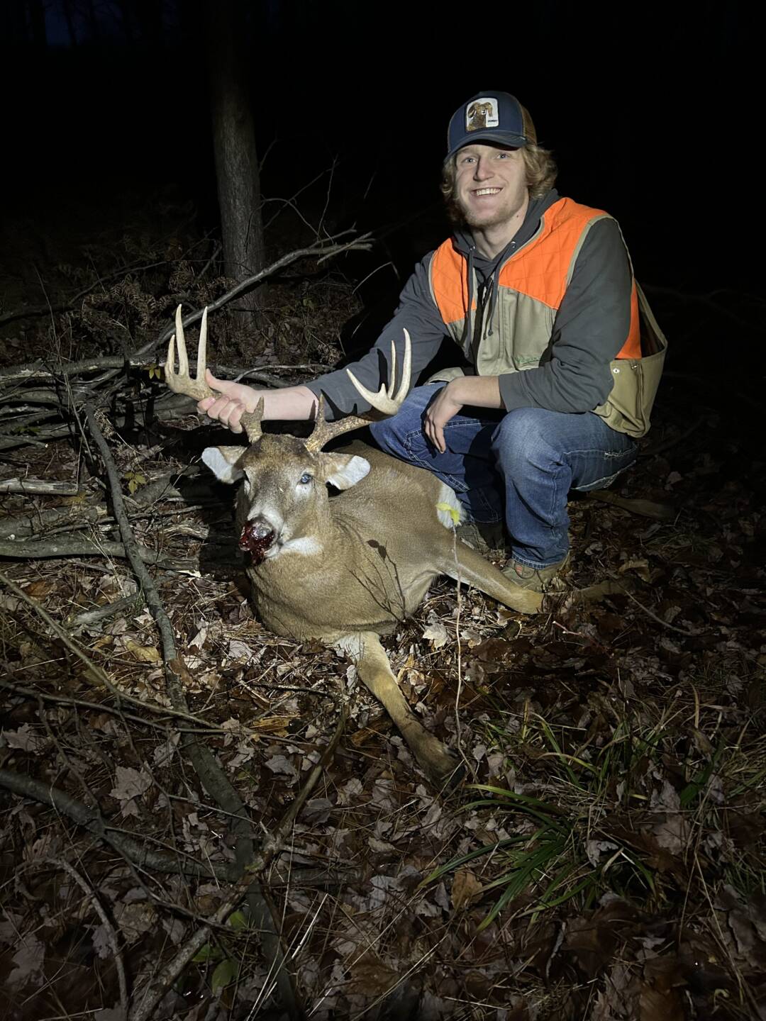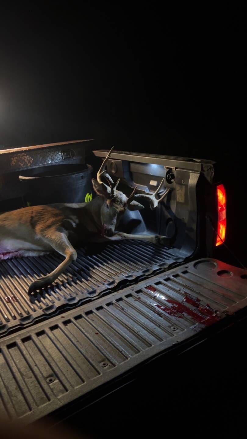 I was hunting with my brother in-law. We were watching a 5 point for over 20 minutes. While on a phone call, my brother in-law noticed this guy walking on the same path as the 5 point. I got the gun up and waited for my chance. After the shot we tracked and found no blood. We found his tracks and stumbled on him.