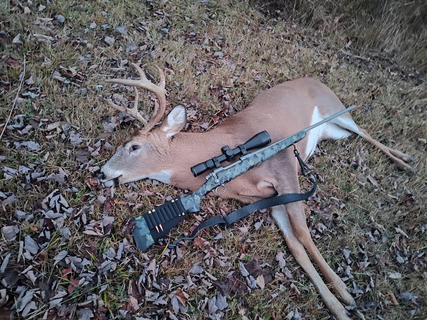 Came down one of my shooting lanes about 5 pm. 175 yard and DRT. 30-06 shooting my own loads with a Speer 172 grain Impact bullet.