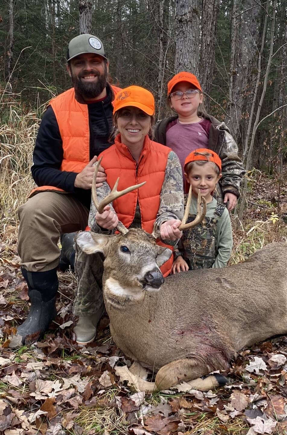 With the whole family all sitting together on Dad’s birthday, anticipation was high for gun opener at camp! We saw a few bucks and does in the morning hours, and 4 more bucks between 12 and 1. Mom’s buck made an appearance at about 12:45 but didn’t give her a good shot. The entire family was glued to the windows waiting for another glimpse. At 2 pm he snuck back in looking for the hot doe that had been frequenting the area all day. Dad stopped the buck with the classic “MEH” and Mom punched him through the lungs at 40 yards! Her best buck and the first deer harvested with the kids! What a family memory!!!