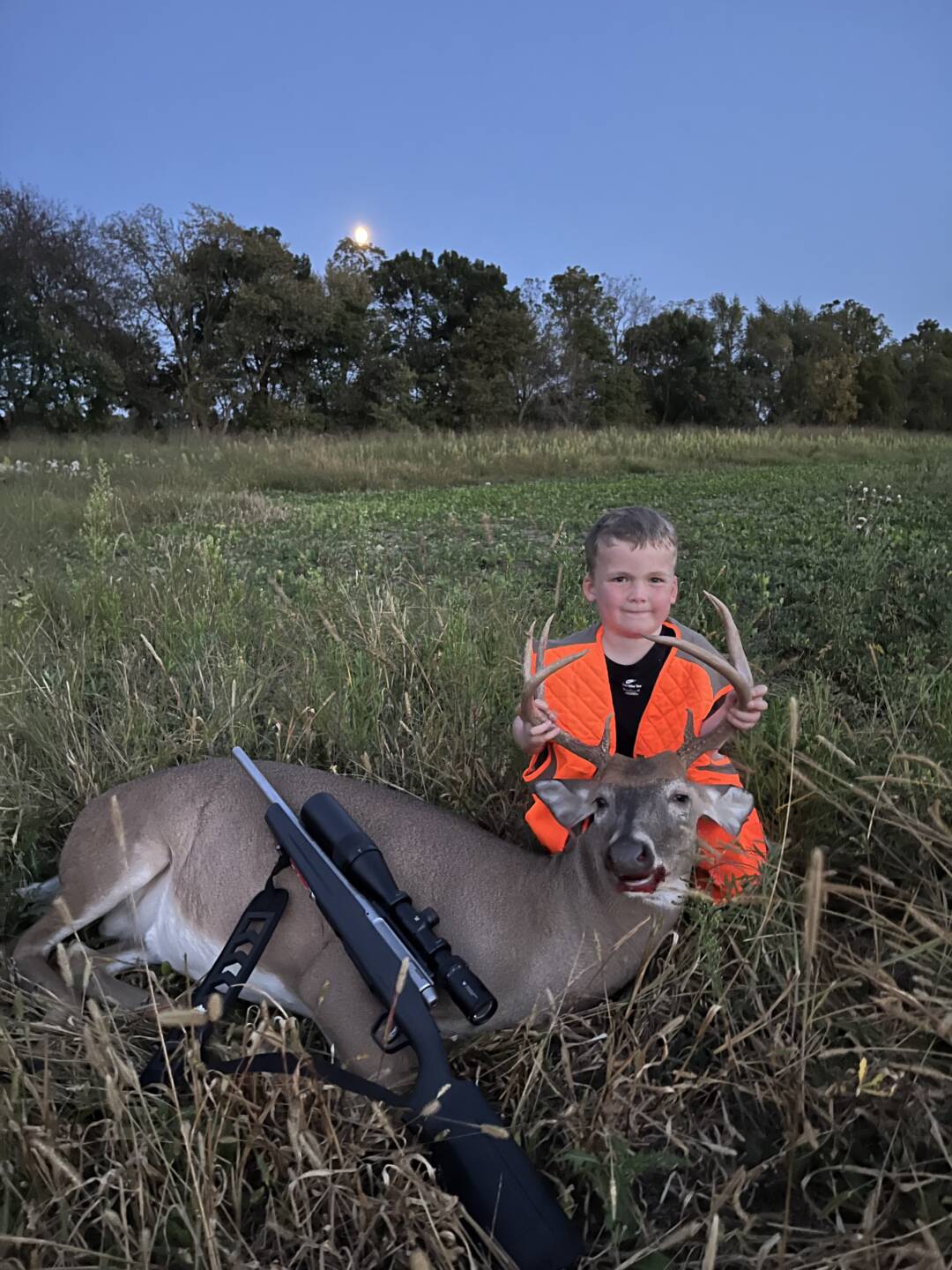 Brody’s six, has been helping plant food plots for a few years waiting for his opportunity to set behind the gun and get his own deer. This summer he did a bunch of shooting in preparation for this chance. Sunday evening everything came together for him. 60 yard shot, buck ran 40 yards and we got to watch it go down.