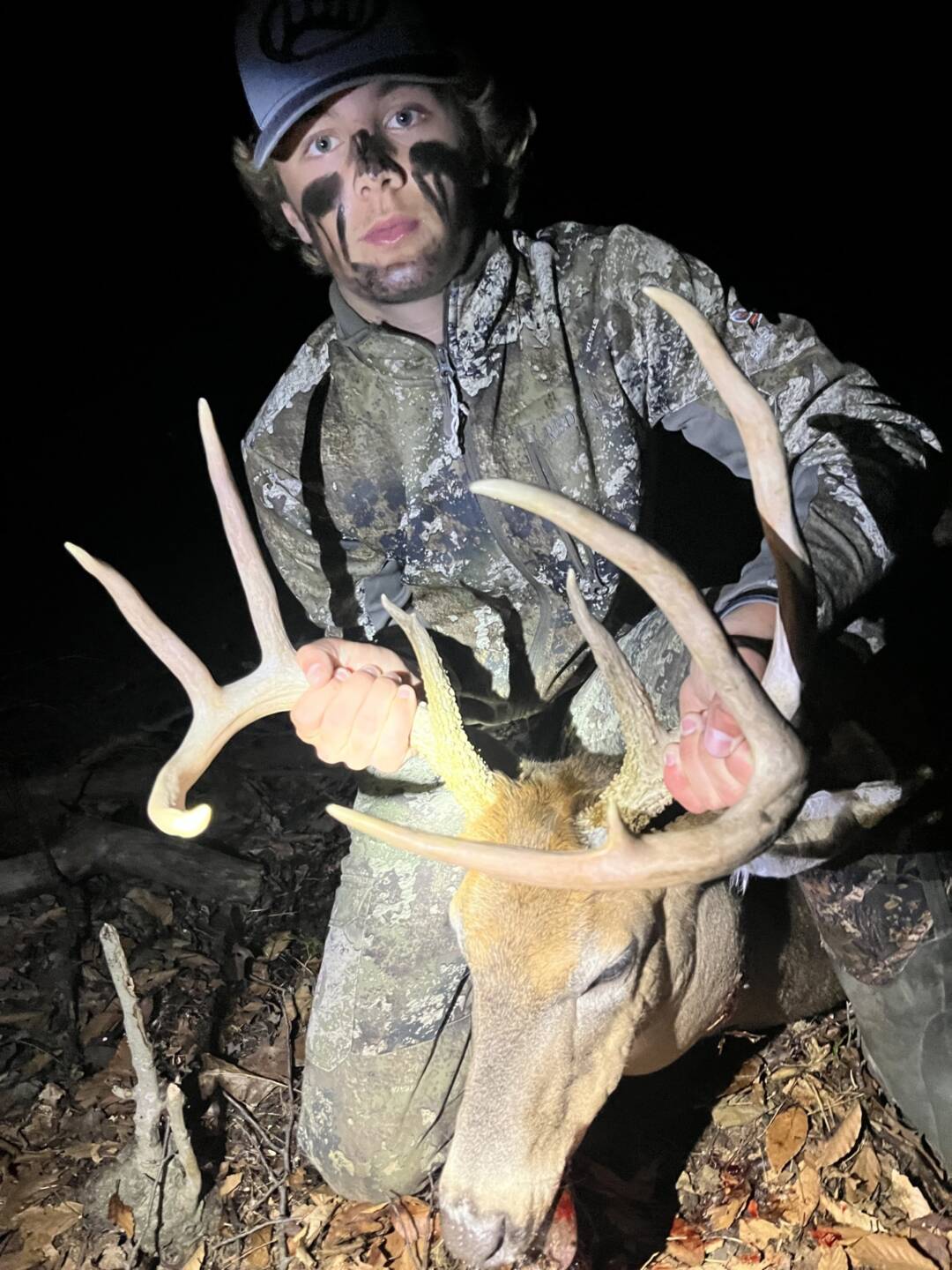 This was my last year to youth hunt, I watched him the previous season and passed him as a 8 point, I watched him the last 3 months on camera, I passed 6 different bucks that evening 3 of them scoring 110-120, my dad kept telling me to shoot the one that was a 120, I told him No, Im waiting for the big 9 point….30 min. before legal shooting light was over he came running through the woods out of no where, I had to grunt at him to make him stop….BOOOOOOM! 1 shot and I dropped him at 65 yards! He ended up scoring 149″