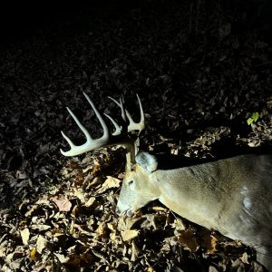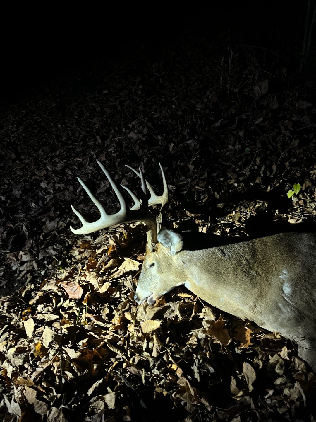 Got my first picture of him Labor Day weekend. Then he disappeared. Showed back up on camera the 11th. Then didn’t show back up agin till the 13th. I was seeing does all day but no bucks. Till he came out chasing a doe at 4:30. Ran right by my blind. He stopped at 80 yards. Got out to track him and found no blood but I was certain I hit him because the way he buckled up and took off. Ended up accidentally walking up on him while trying to find first blood. Ran about 60 yards and died right inside the woods.