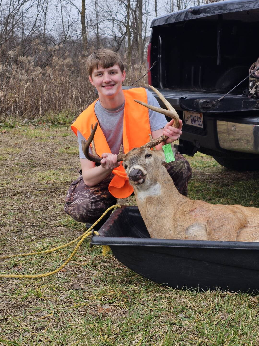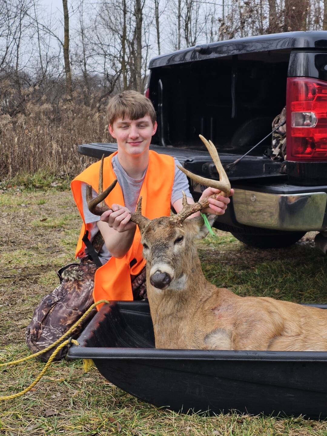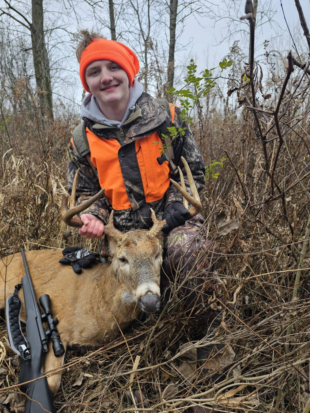 Decided to head out early and sit all afternoon. Got to the stand about 1:45 but didn’t see anything until 5:15 when this guy snuck out of the tall thick brush. As soon as he hit the mowed 15 yard wide swath he began trotting. Gave him the trusty Meh, Meeeh as I was lifting the 350 Legend up to get on him. He stopped, looked, and as he took his first step to trot into the tall brush again, I pulled the trigger. He jumped really high in the air and mule kicked. I called my dad and let him know I just shot the biggest buck of my life. We waited until dark and started looking, and looking….and looking. We never could find blood or hair anywhere. We began grid searching and still no sign of a good hit. After an hour of searching in the dark and no blood we decided to back out and look in the morning. We started back at the beginning and worked our way through the thickest stuff in his direction of travel. After 130 yards we found blood. After another 20 yards he laid their dead. Great quartering to shot, just in front of the shoulder, exit just behind the far shoulder. Good thing we backed out last night. Even with good shot placement it was a one lung hit.