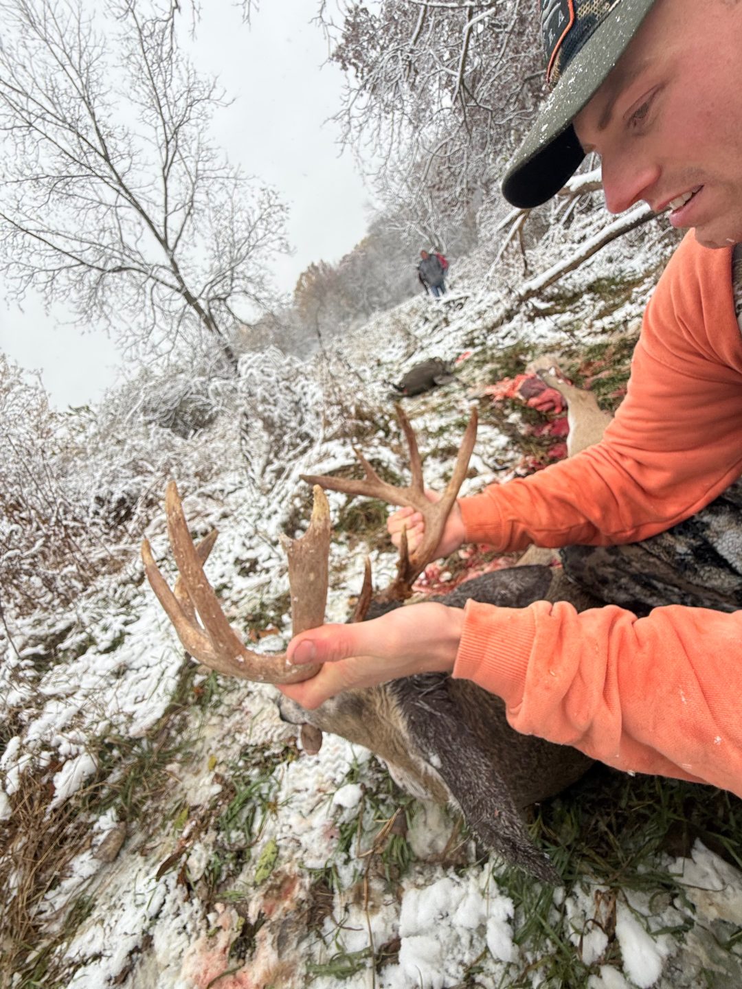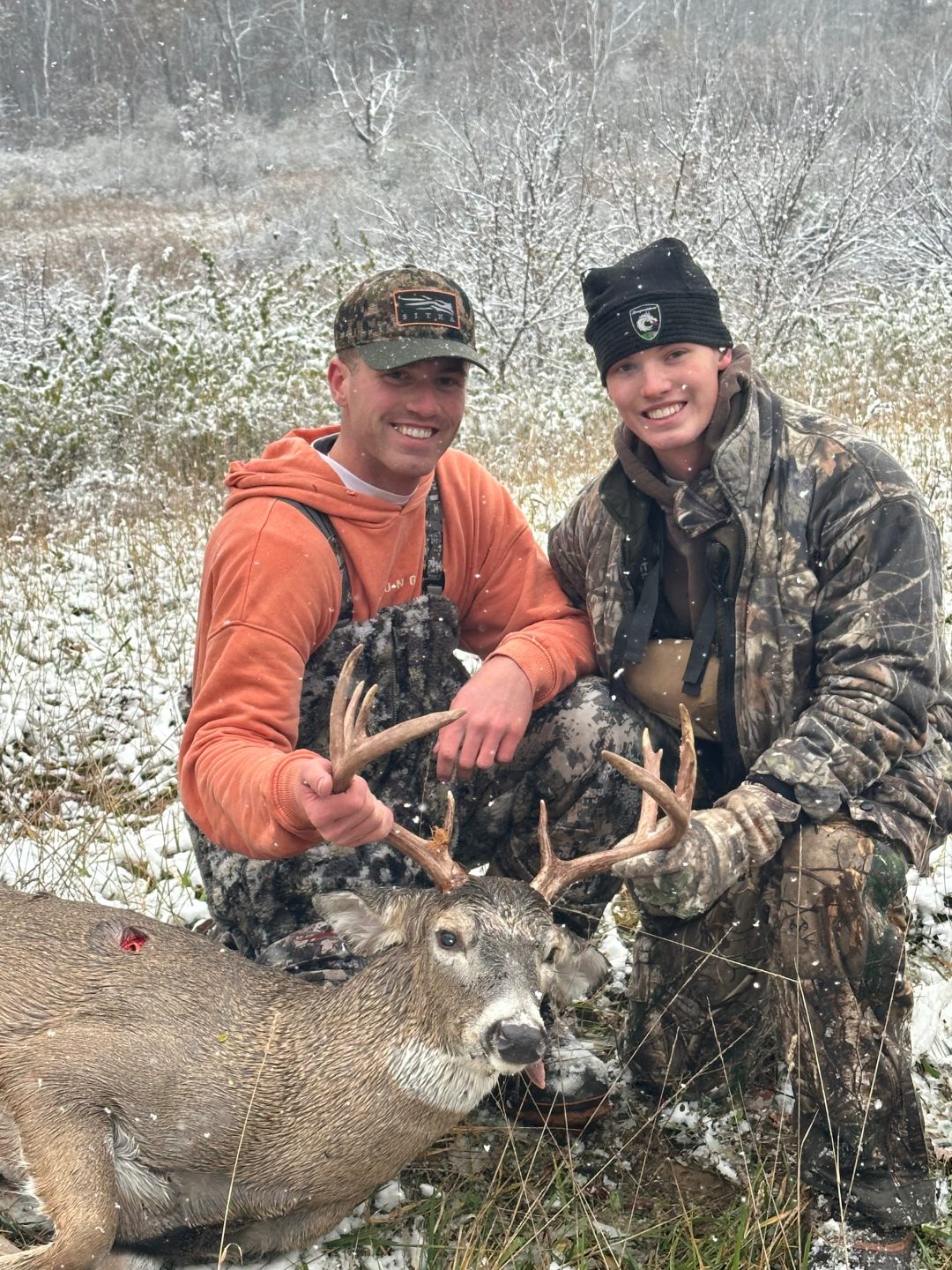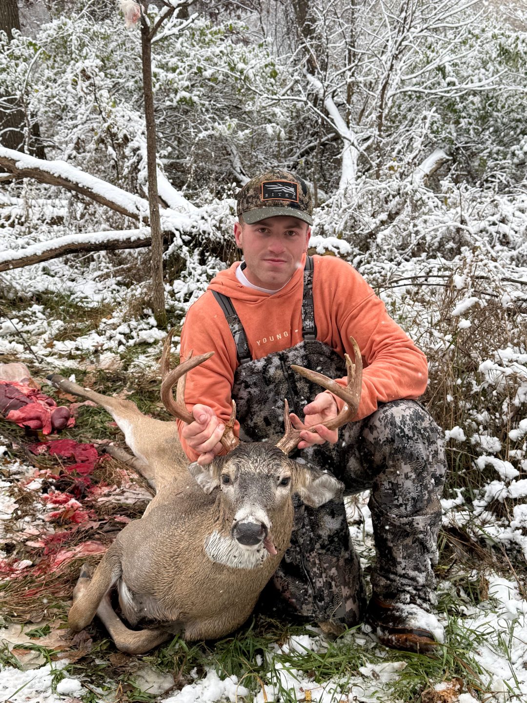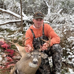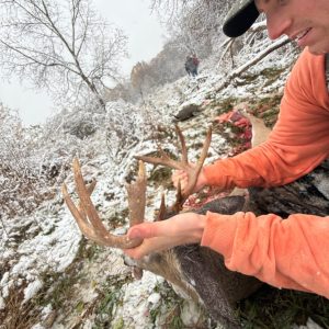 Was in the stand this morning and as I’m standing there my release unscrewed off I don’t know how but it did, it fell on the ground so I had no way to shoot something if it walked in so I thought the hunt was over so I go down to look for it at 7:10 and some how I found it I got back in the stand and hit a few aggressive grunts and at 7:15 he came walking. He came into 27 yards and the rest is history.