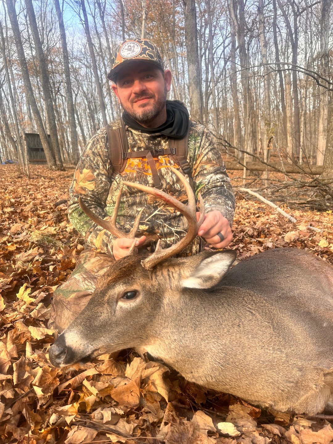 I had a little yearling come through browsing and a little three point cruising the top of the ridge. When they passed i grunted once. Three minutes later i saw movement 130 yards out. He came in on a string. Shot him at 15 yards.