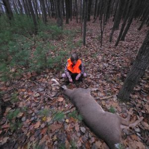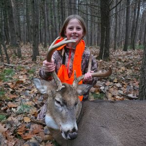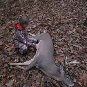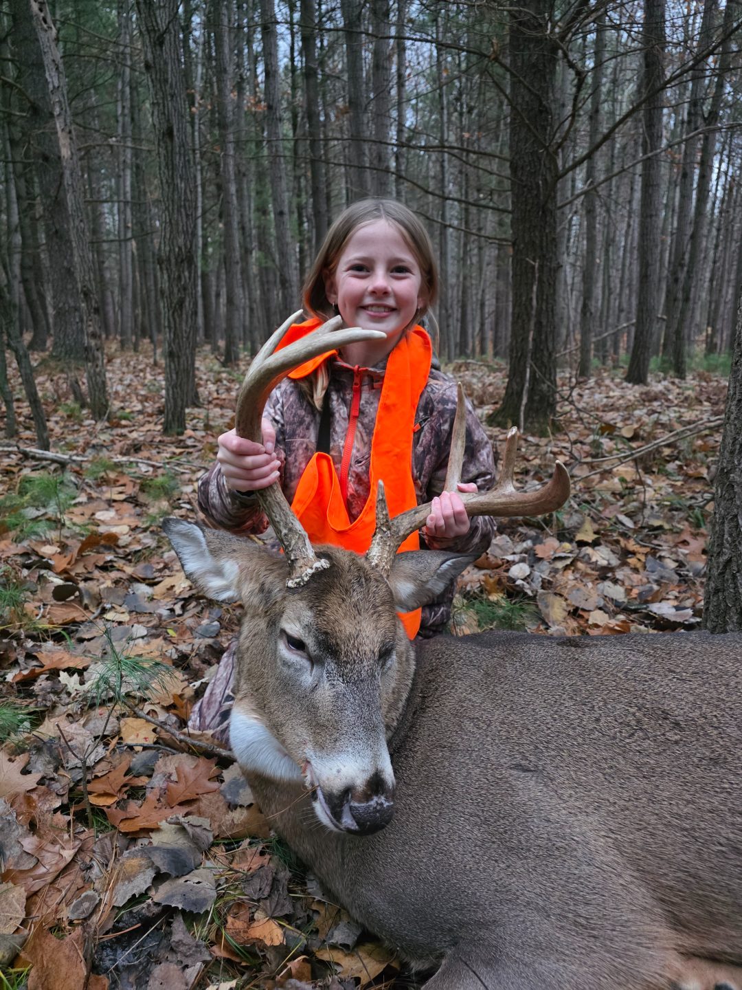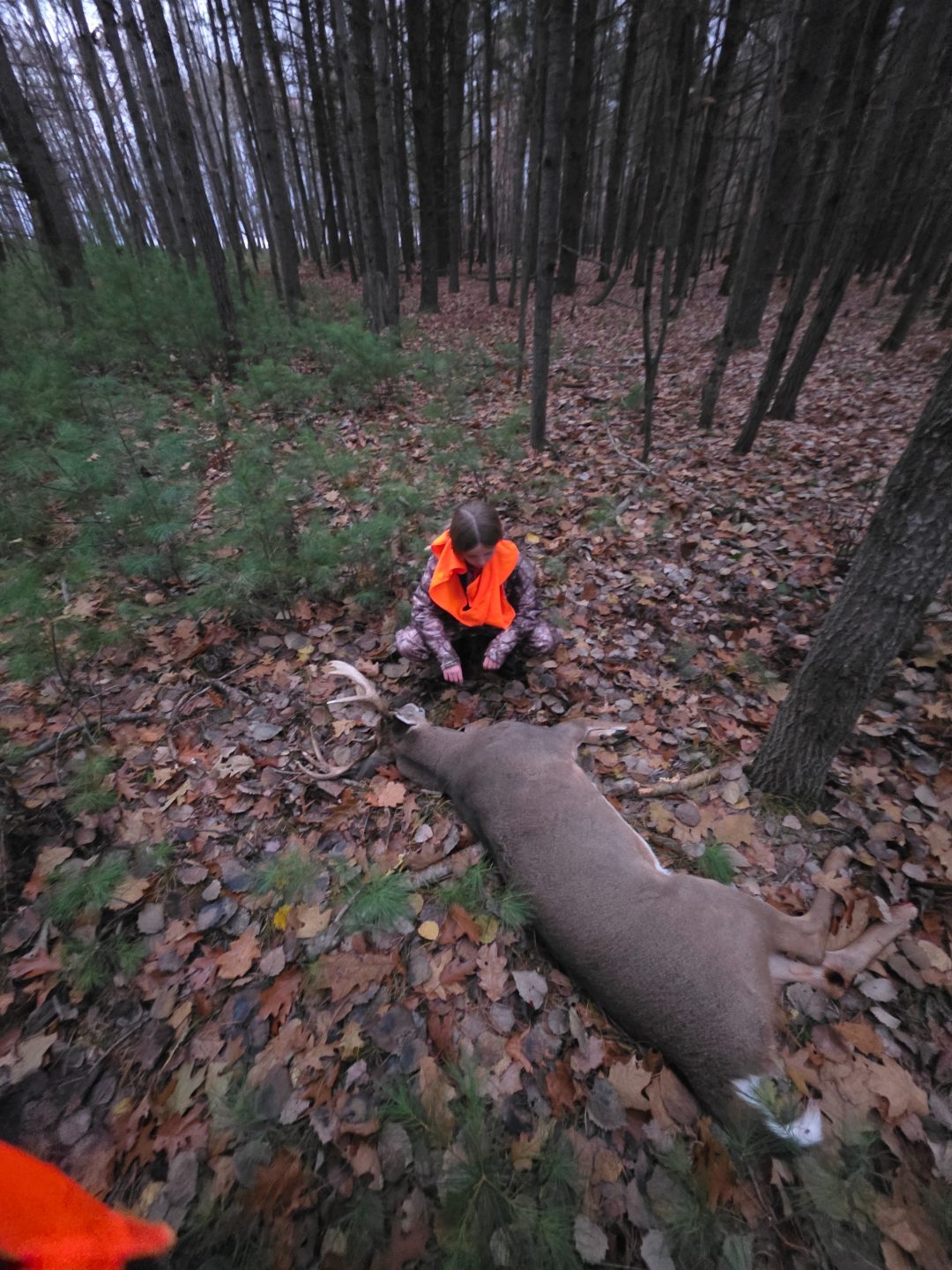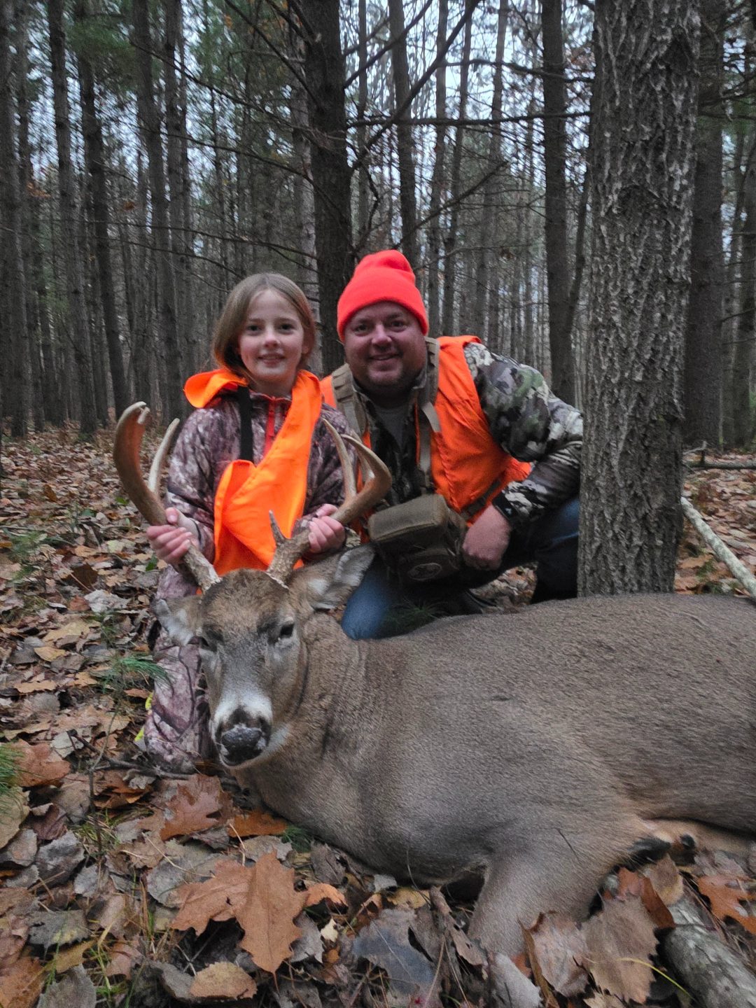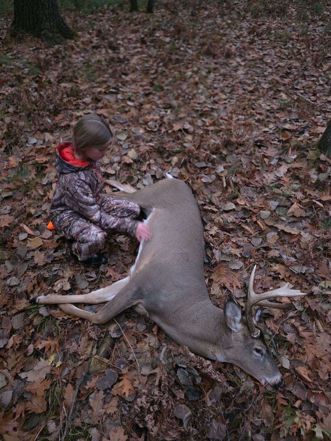 After watching some does and smaller bucks run around, this one steps out into the shooting. Without hesitation she gets on her .350 and puts a great shot him. Chloe and her brother did most of the tracking. After the 60 yard track we celebrated her first buck!