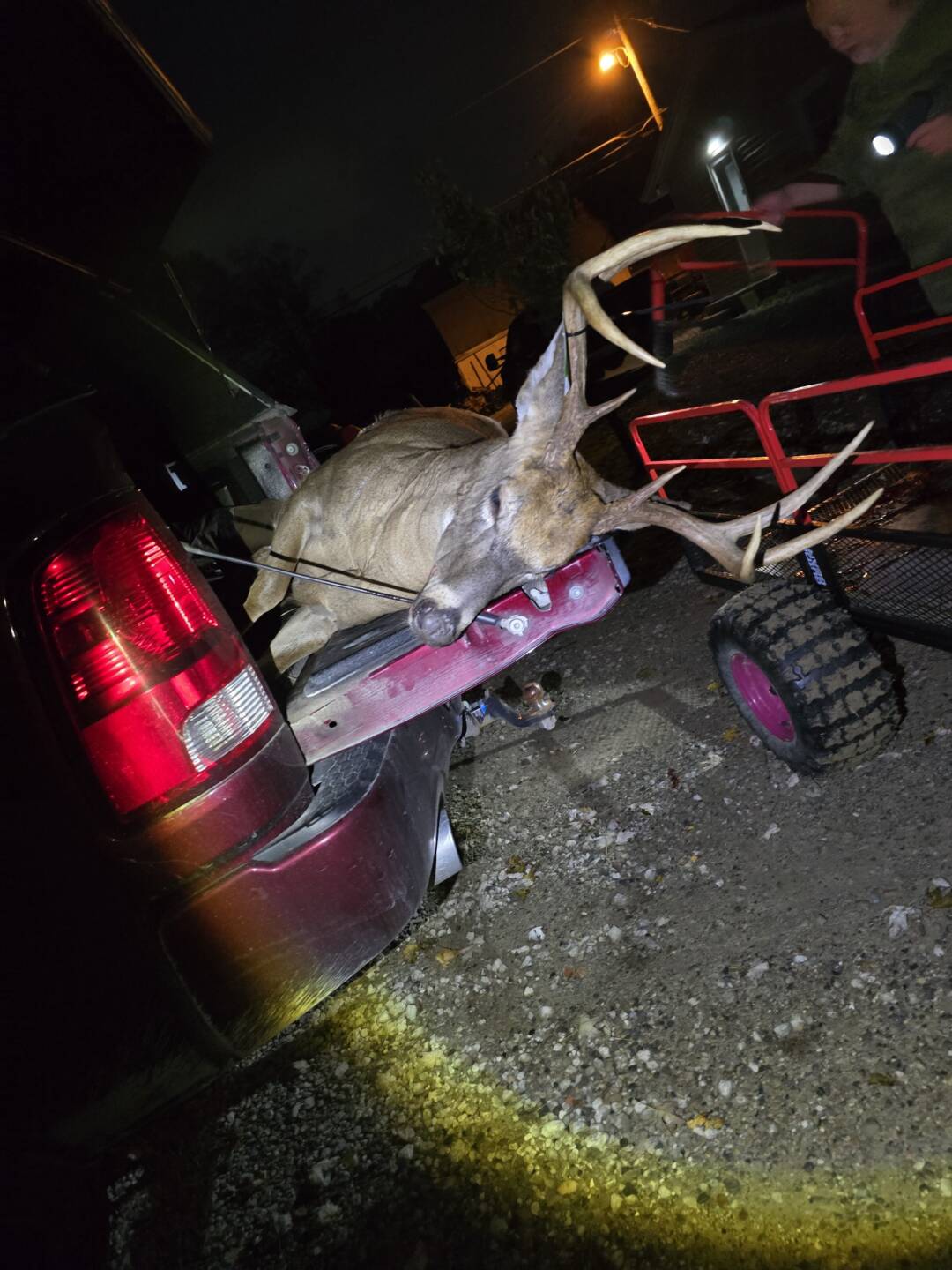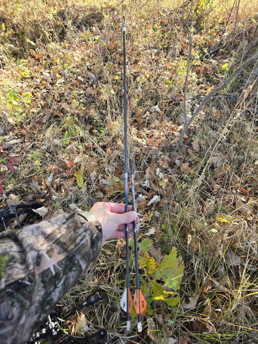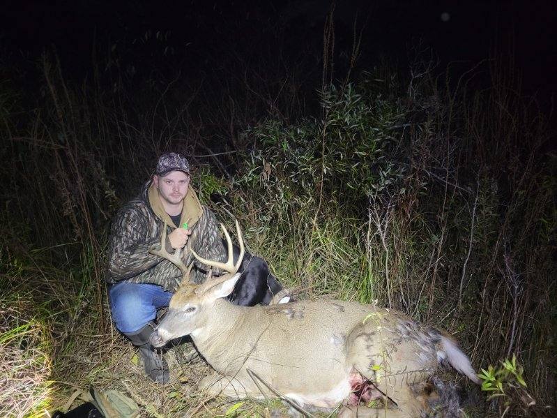 Checked the weather the night before and the cold front was going to bring 32° temps and west wind at 2mph. I decided to go sit in the morning. I awoke to find a super bright hunters moon. As I drove out to the property I saw deer on the side of the road in the fields and thought that was a good sign. However the bright moon had me skeptical. I arrived at the property at 430am. I got out and started getting my pack and clothing all organized. I got out to the woods at 5 and found myself face to face with a coyote who snuck up to me at 20feet. Yet another reason I was sure I wouldn’t see anything. I kept on walking thrown the trail and stepped off into the woods and found a tree in an area I haven’t sat yet and could hear the acorns falling. 530 at the base of the tree I start setting up my climbing sticks and make my way up. I get set and quiet by 615. I had to move slow and quiet as I was setting up 45yards from a thick bedding area. Iafter sitting for a while I could start hearing deer walking around and could make out the bodies as they walked through the woods. 7am came around and I decided to send my antlers to the ground with my bow rope and bang them together on the ground and ontop of a small sapling to make it sound like two bucks were fighting. 10 mins later three does come out and eat acorns. I watch them for about 20 mins until I heard loud heavy steps coming from the west bedding area. I got my bow in hand and get behind the tree (i was using a saddle) As I was watching him walk in I noticed it was a huge body 8 pt. I decided to take the shot. As I drew back and settled in with the 20 yard pin just behind his shoulder I noticed two branches in the way of him. I held it at full draw for 3 mins until he stepped out of the way and I let it fly. Shot looked great. However my arrow didn’t pass through. As he turned and ran the arrow snapped off on the thickets and laid on the ground. I waited until 1030 to get down and look. Found the arrow and found what looked like good blood. I decided to start tracking. I followed a good blood trail for 100 yards then jumped him out of a bed. I watched where he ran to and backed out. I went back later that day 8 hrs later to the bed I jumped him in and couldn’t find any blood. I walked all over the edge of the bedding area. I tried to crawl through it but it was to thick. I decided to call in a dog who came in at 10pm after driving 2hrs one way to get to me. (Only person who would take the track, others local didn’t want to.) I knew the deer was dead as I got within 7feet of his bed before he jumped and ran off. After a less then 5 mins tracking job, we recovered my first ever 8pt and largest buck to date. I walked by him several times but never saw him with how thick it was. He only went another 75 yards in the tickets before he bedded down again and expired. After reviewing the shot area we found a third branch that deflected the arrow into the right side through the liver, out infromt of the least rear leg and the broadhead and insert was stuck in his rear lower leg.