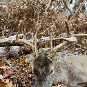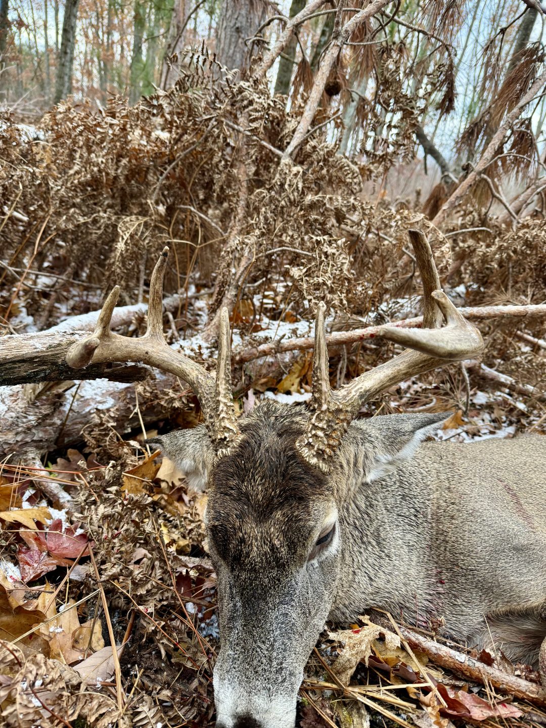 Was watching a doe walk over a ridge coming towards me. She was moving pretty fast so I started to glass around to see what might be following her. Noticed something about 200 yards away in some dense pines. As it got closer I noticed the antlers. Pulled the gun up and tried to get him to stop but he was trying to get to the doe. So I took a shot while he was on the move. He dropped where he stood. Then he started to kick and stand up on his front legs, he manages to go about 5 yards then lay down in some ferns. So I got out of the tree to go put him out of his misery. When I got about 10 yards from where he was laying down he picked his head up and then popped up on all 4 and took off. I brought the gun up and pulled the hammer back and shot as he was running away hoping over some fallen tree branches and he dropped for the second time and that’s where he expired.