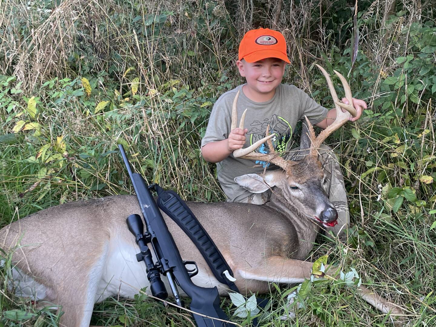 After a few close calls, 7yr old Chuck Patrick made a perfect 147 yard quartering to heart shot with his .350 legend. This was his second yr deer hunting, but his first shot on a great buck! Charlie took his first turkey this spring 20 yards from where he shot this buck.