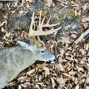 This buck showed up about a week prior. On the 23rd I had him at 40 yards but with the big winds I couldn’t get him to stop in a clear lane. He moved through and eventually followed a doe down a ravine. A couple days later I got in the same tree but facing a different direction. I first spotted him around 4:57 and he walked right under my tree before I could even get my bow down. Another younger buck was off in the distance and he took his attention off of everything else and walked right out to broadside at 25 yards. Fired the shot at 5:01, one of the shorter sits I’ve ever had.