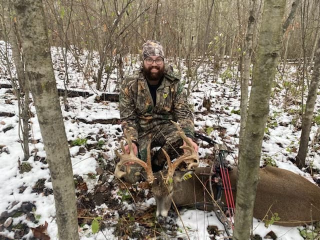 Well, I shot the “state land” buck of a lifetime yesterday. He showed up on my camera mid day the beginning of November. I noticed the tags on his ears, and thought what’re the chances? Saturday I hunted in the wet snow, and he showed up again mid day, just hours after I called it quits. At this point, I was moving into that spot. I loaded up my bag with any gear and snacks I thought I may need, strapped it to my tree climber and hiked in about a 1/2 mile to my spot. Somehwere around 8:30 I was watching a decent 8 harassing some does on the other side of a creek. I grunted, and snort wheezed, watching him charge towards me and stop at the creek, he was 40 yards looking around for the buck, I fooled him. He turned to head back towards the does and another buck came charging in behind me. A nice shooter 8. They squared each other up from opposite sides of the creek, and made rubs and grunted for half an hour. I think I almost started a fight lmao. Those deer wander off and I’m watching a couple does across the creek, I finally decide to sit down and tell the boys about my awesome experience, I was already satisfied with the hunt, that was fun to watch! Just as I sit down I here something cross the creek. I stand up and turn around slowly, staring through the thick brush and I caught a glimpse of white antlers slowly heading my way. I grab my bow and stare into the brush using my tree for cover. He hits a small opening and I catch half of his rack and realize it’s bowinkle, my jaw about hit the ground. I couldn’t believe this may actually happen. He zig zagged through the brush making me wonder what side of the tree he would come out on. He came in to my right quartering towards me, he went behind some brush I drew my bow, he was still quartering to me through the first couple openings so I held my draw and waited. He hit the third and turned broadside at 18 yards. I stopped him and let the arrow fly. There lies bowinkle, the state land buck of a lifetime that escsped a deer farm.