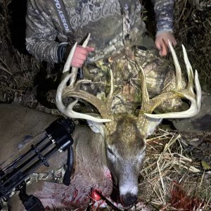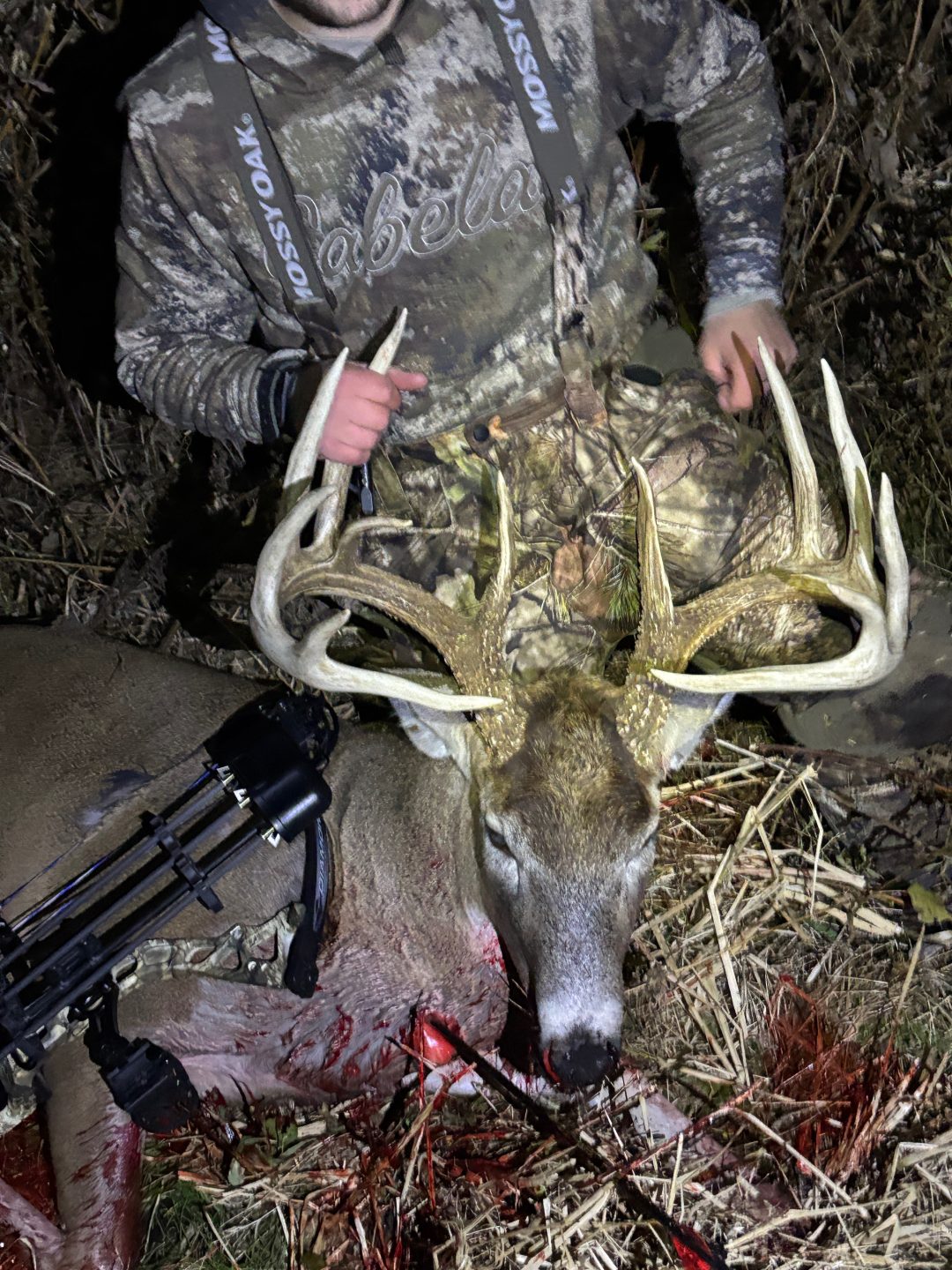 My son had a dinner date with his girl friend so he climbed out of his tree before hunting hours were over. As he was walking thru the trail he cut in the CRP a doe ran in front of him. He could hear antlers in the CRP so he knocked an arrow and prepared for a shot , as the deer entered his trail it turned towards him at 20 feet so he released and connected. Green score 180 7/8”