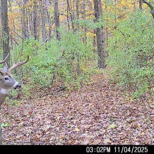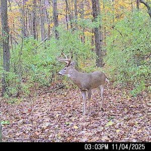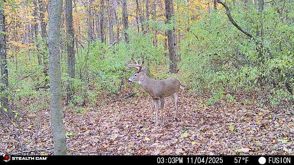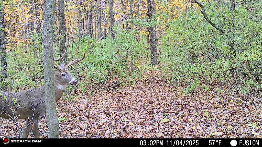 Saw him on camera two days earlier timestamped and hour before I was walking in the woods. Two days later he came sprinting through chasing does , couldn’t get him to stop, then he came back, I drew but needed him to walk 5 more yards but he didn’t. About a half hour later he came back and I got him to stop after grunting at him 3 times. Cool drop tine 10 pt.