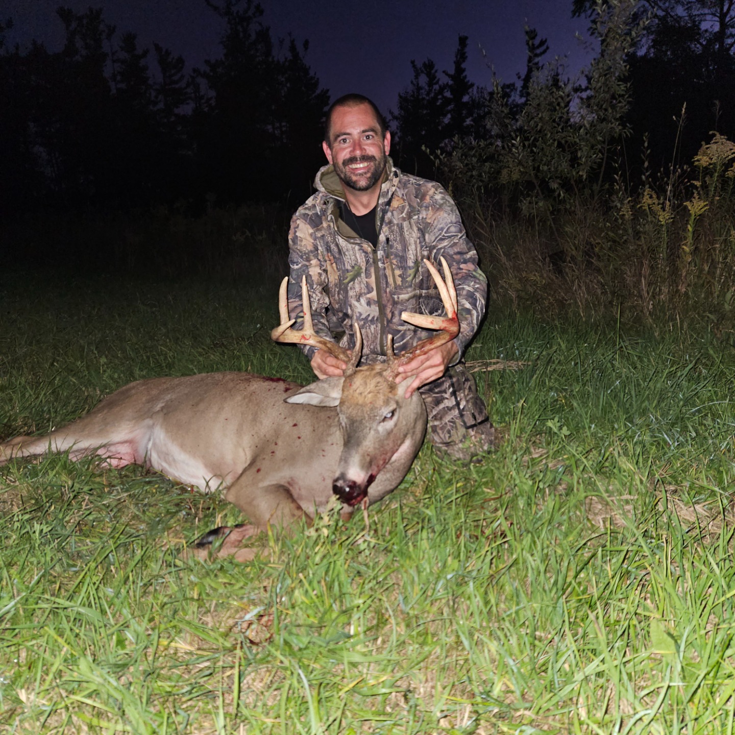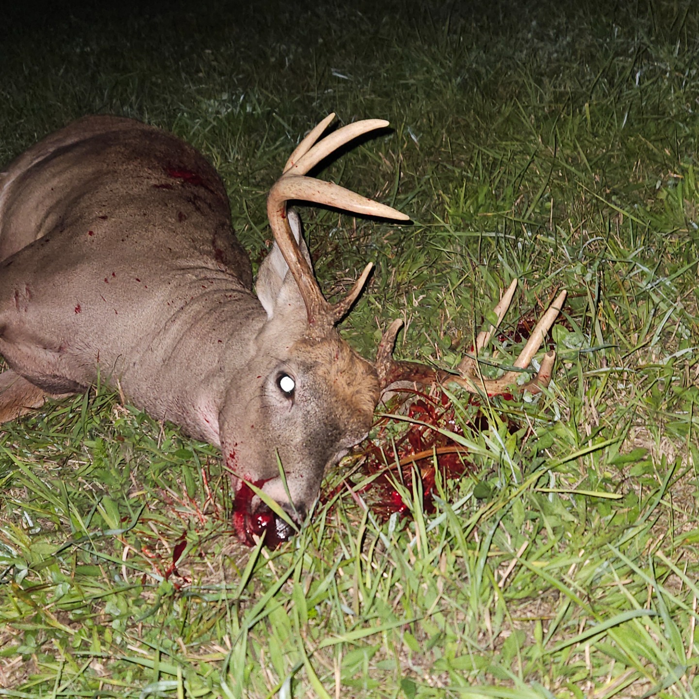 Got to the stand late because I had to work during the day. Got into the stand at 6:45pm and this guy comes sneaking in within a half an hour. Got him at 7:20pm, 10 yards under the stand. This one is extra special because I lost my Grandmother the day before. She always made sure the boys had everything they needed for deer camp. A special hunt with my Grandma!