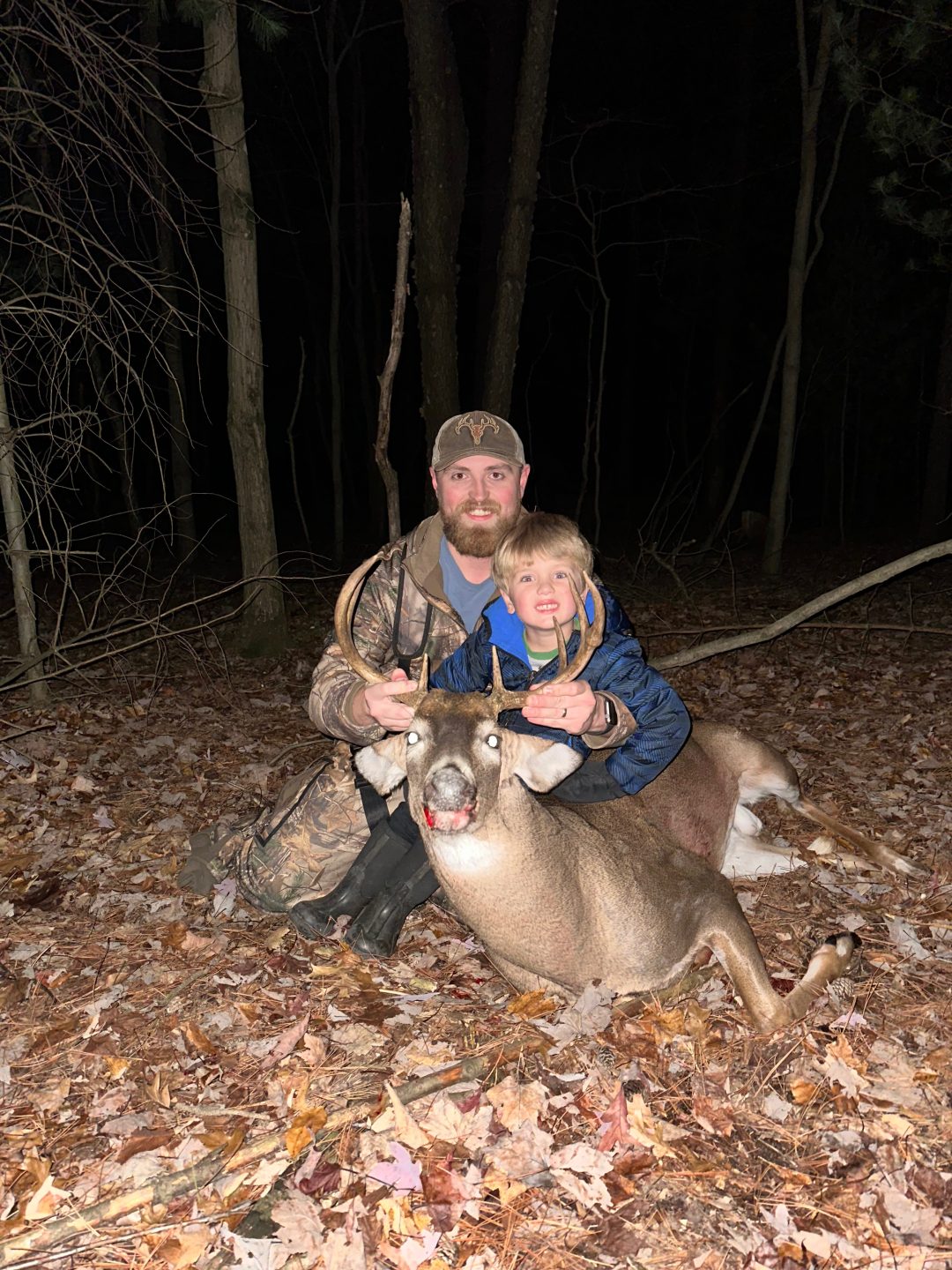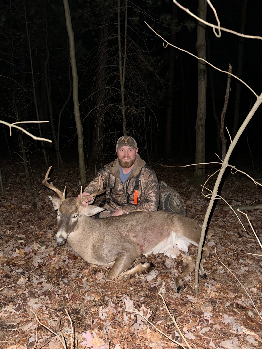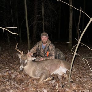 Saw this buck chasing a doe 5 minutes after sitting down, then at 3:40 he chased her up to the ridge 20 yards from me, I drew back but he stayed behind a pine tree for 2 minutes until finally stepping out. Double lung, ran 120 yards and piled up. My son was able to track with us for the first time.