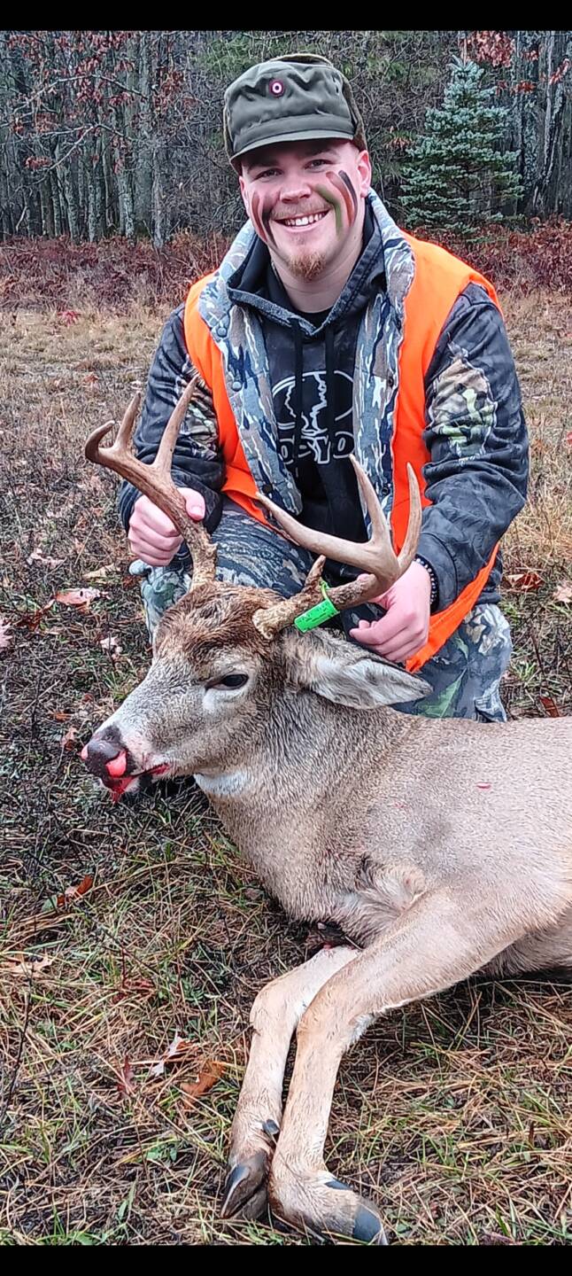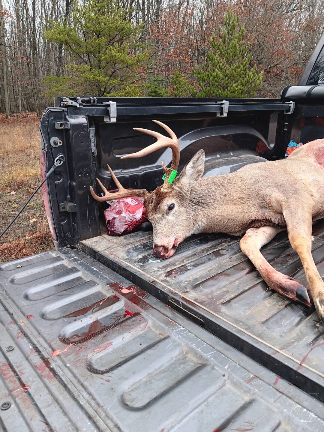 I was outside of the blind taking a crap and looked over my shoulder and saw him standing in the field looking at me. I scooted over to the blind and reached in and grabbed my rifle and shot the buck while he was quartering to me and dropped him. I then pulled my pants up and went over and gave him a finishing shot while he was thrashing around.