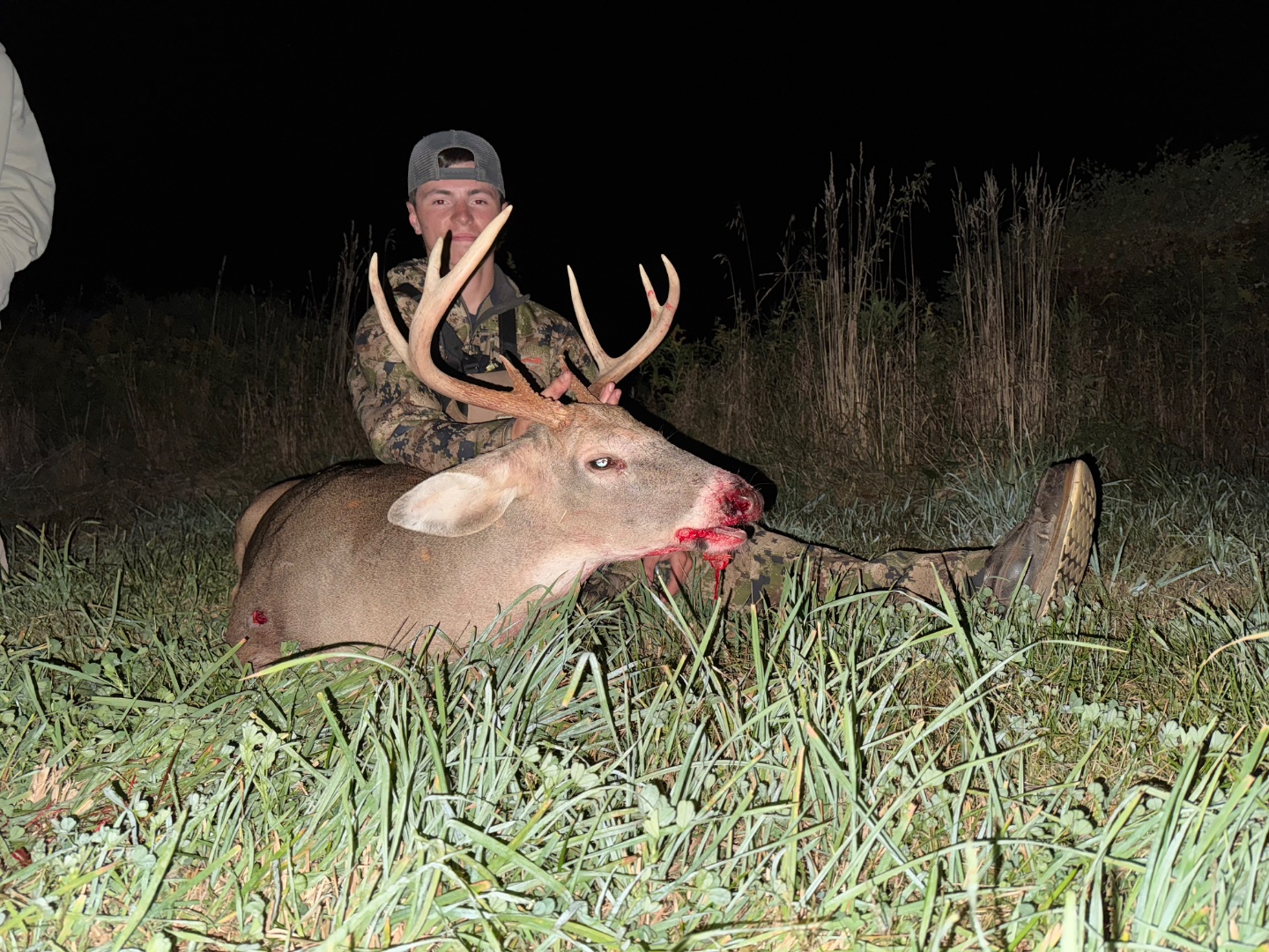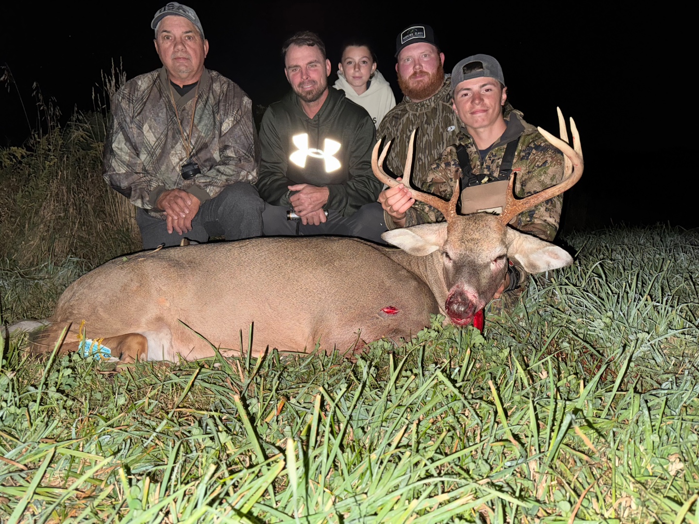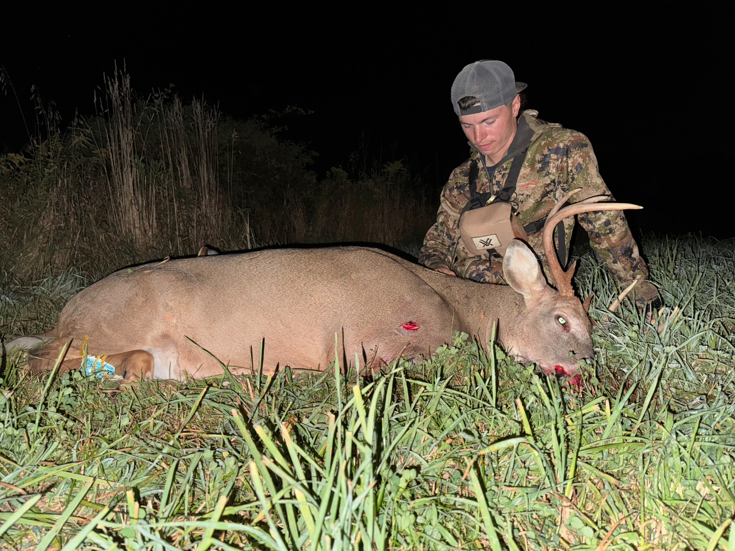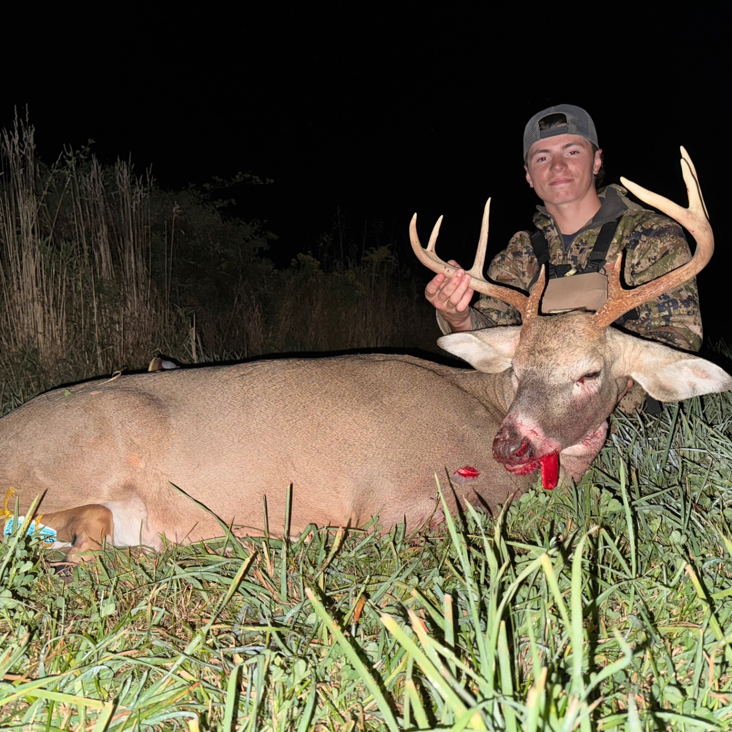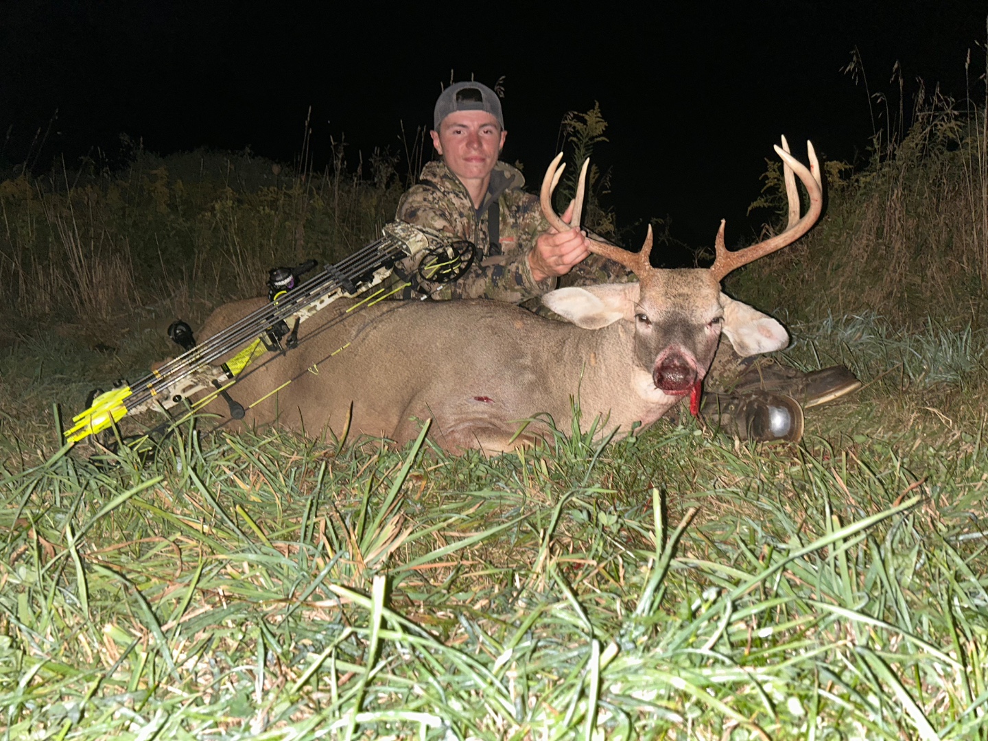 After not seeing anything all evening I was starting to think the hunt was a bust then at 7:20 I had two doe’s come running towards me and they stopped at about 60 yards and both looked back so I grabbed my bow and this guy wasn’t far behind he pushing them closer and he gave me a 40 yard shot. After I seen the lighted nock hit him where it did I knew that was a dead deer running, he only made it 70-80 yards before crashing.