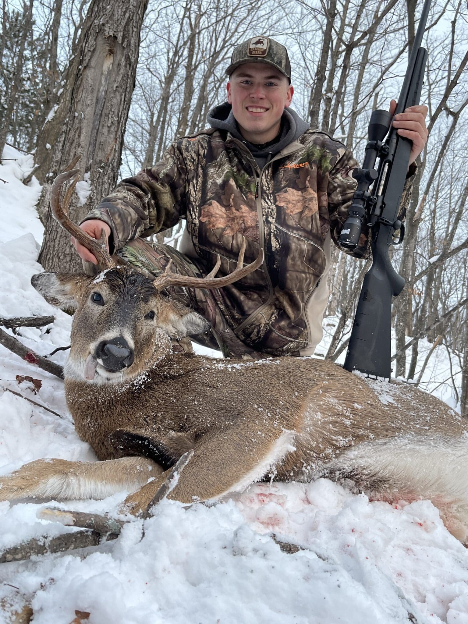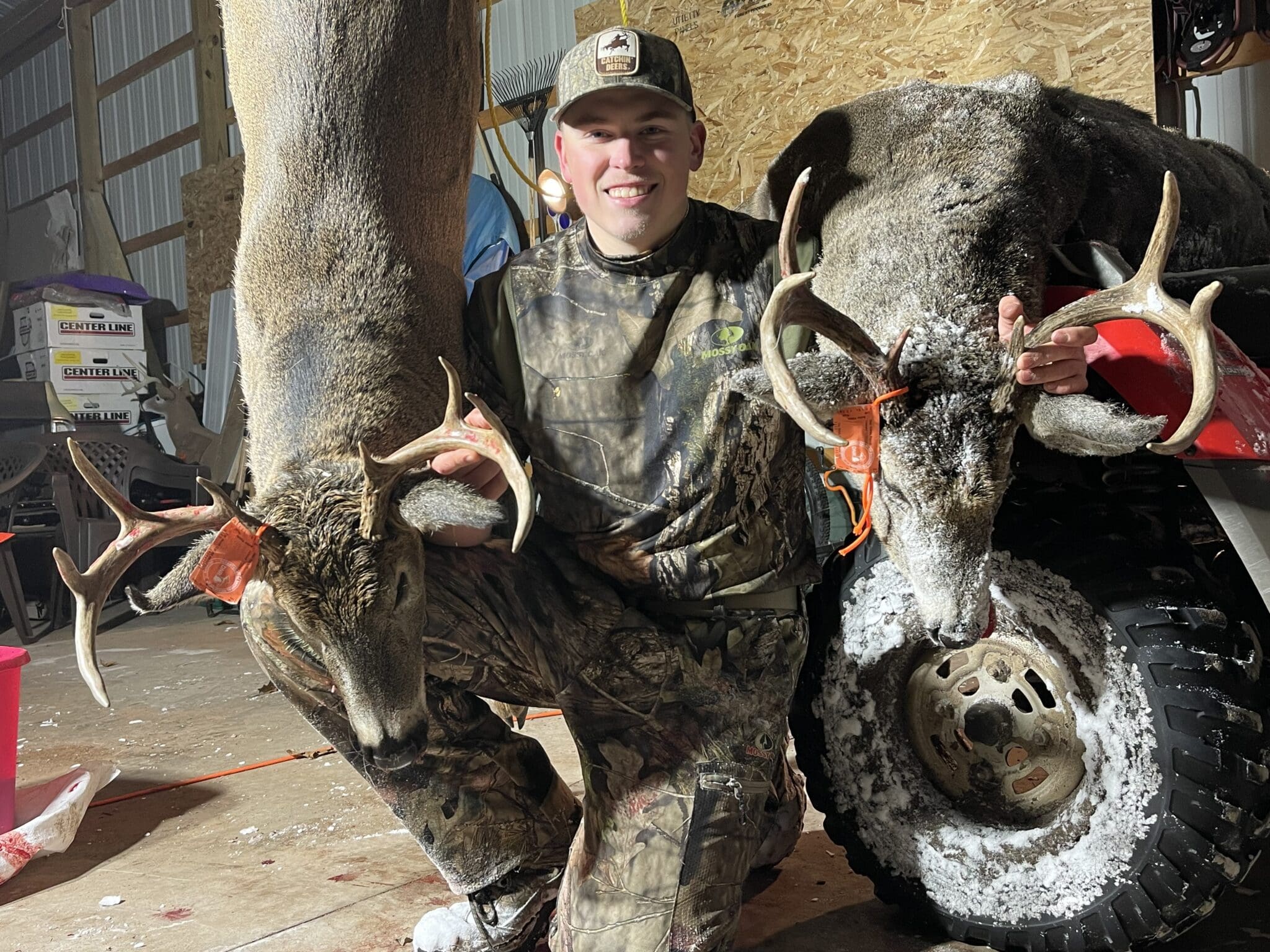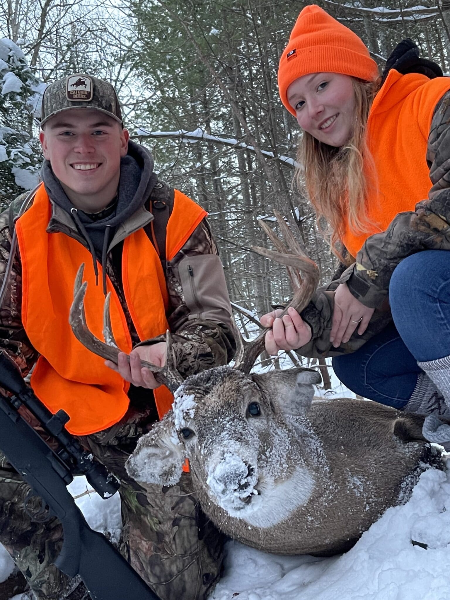 On the 18th was doing an all day sit in hopes of some action during the rut. Saw plenty of doe and a couple spikes. Around 4:20 had two doe and a button buck in. Heard some grunting aways away so started looking. Had another grunt right next to me and the smaller 8 came in. Heart shot him at 20 yards. Didn’t go 20. The next day after finding out the big 8 was still alive, I had to go sit. My girlfriend came with for the afternoon sit. Plenty of action between does and some younger bucks. Eventually around 4:25 in the corner of my eye I see the big boy rolling in. A bunch of the doe took off and with this buck getting ready to chase, I had to make it quick. Shot him at 40 yards. Went about 20 and dropped. Best season yet. Big thanks to my dad with the help this season.