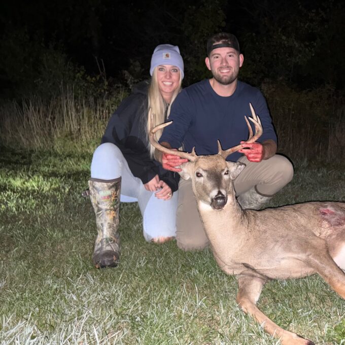 Had a buck come running through at first light. Grunted him back and this guy came running in behind him. Shot at 40 yards. Had great blood through the woods and lost him out in the field. Got the dogs out there and found him a couple hundred yards away