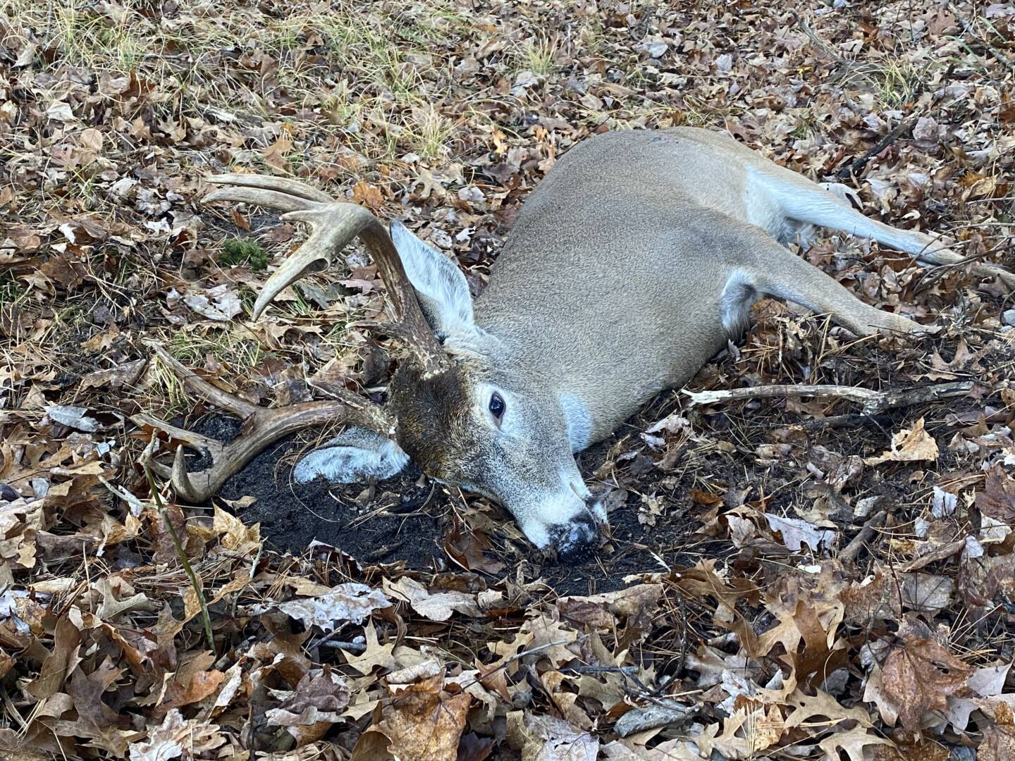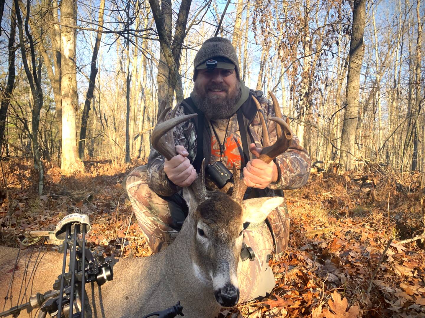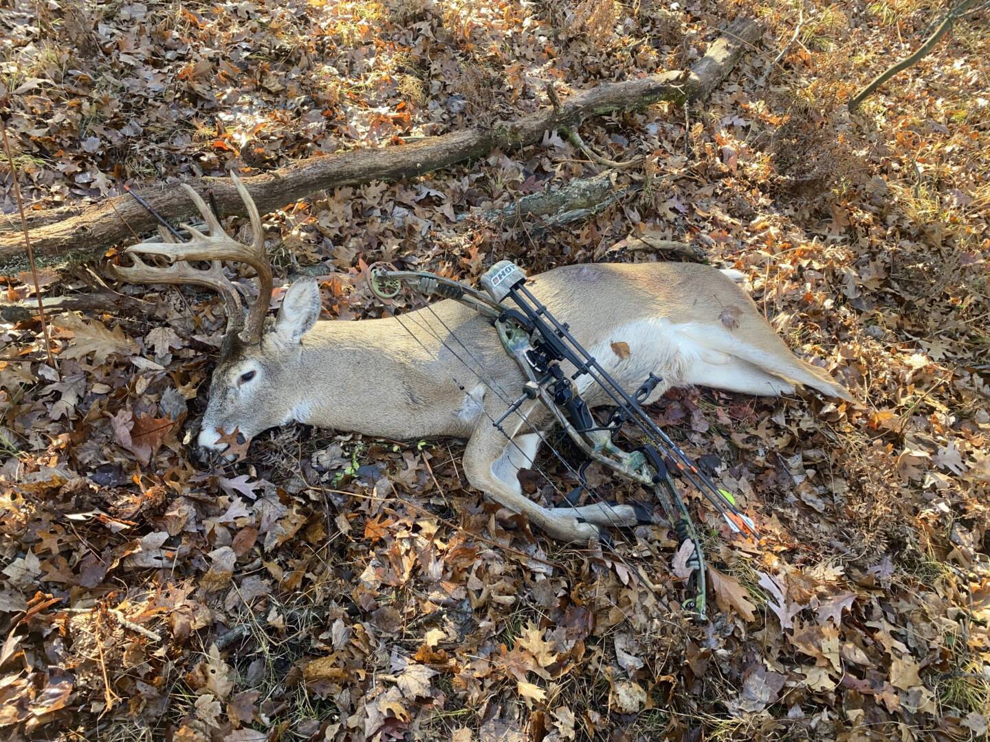 Came in chasing 3 does. Stopped behind some brush with no shot, then took two steps into my shooting lane at 20 yards. Clean double king pass thru shot. Just spun around bound off about 10 yards then slowly walked away with a wobble to him then just went down at less than 30 yards, saw him just go down and head fall back. First buck with a bow, after many many years of hunting.