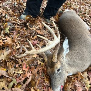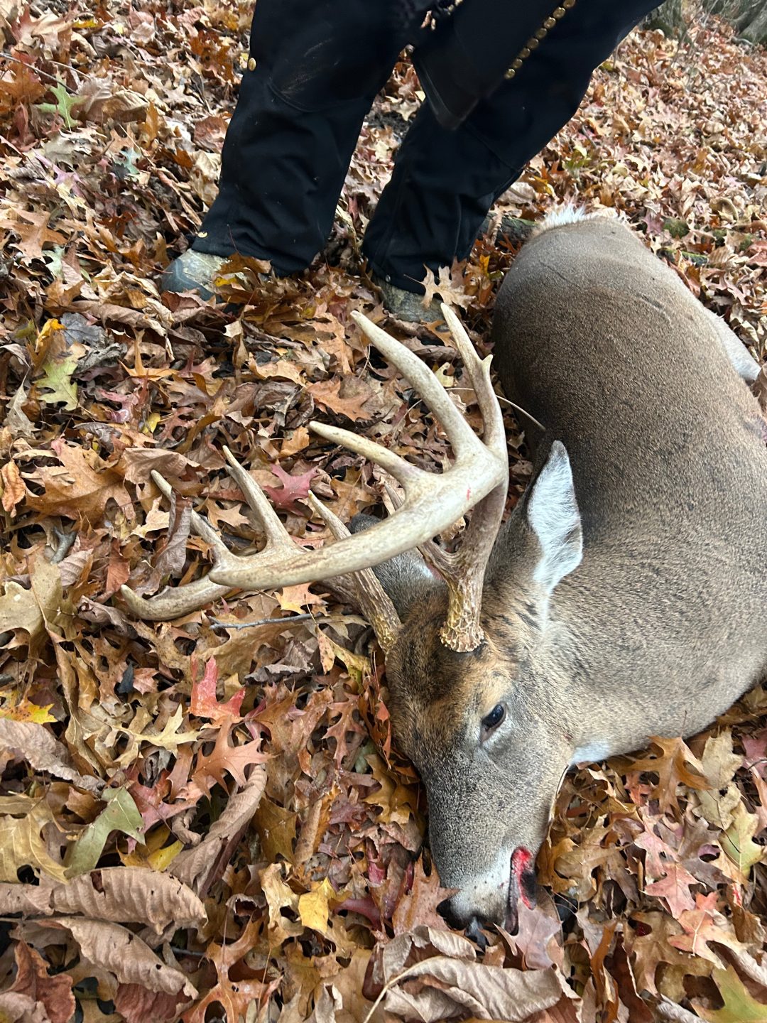 Got out late 6:50 he came on at 7:05 was going to shot him front shot but the gun only clicked forgot to load gun being in a rush to get out got shell in chamber waited for him to stop looking at me he finally gave a side shot he ran off waited 1/2 hr started tracking with neighbor to help found him still standing in wood walking he fell over and got to him and finished the hunt never had that happen before just a crazy hunt