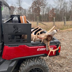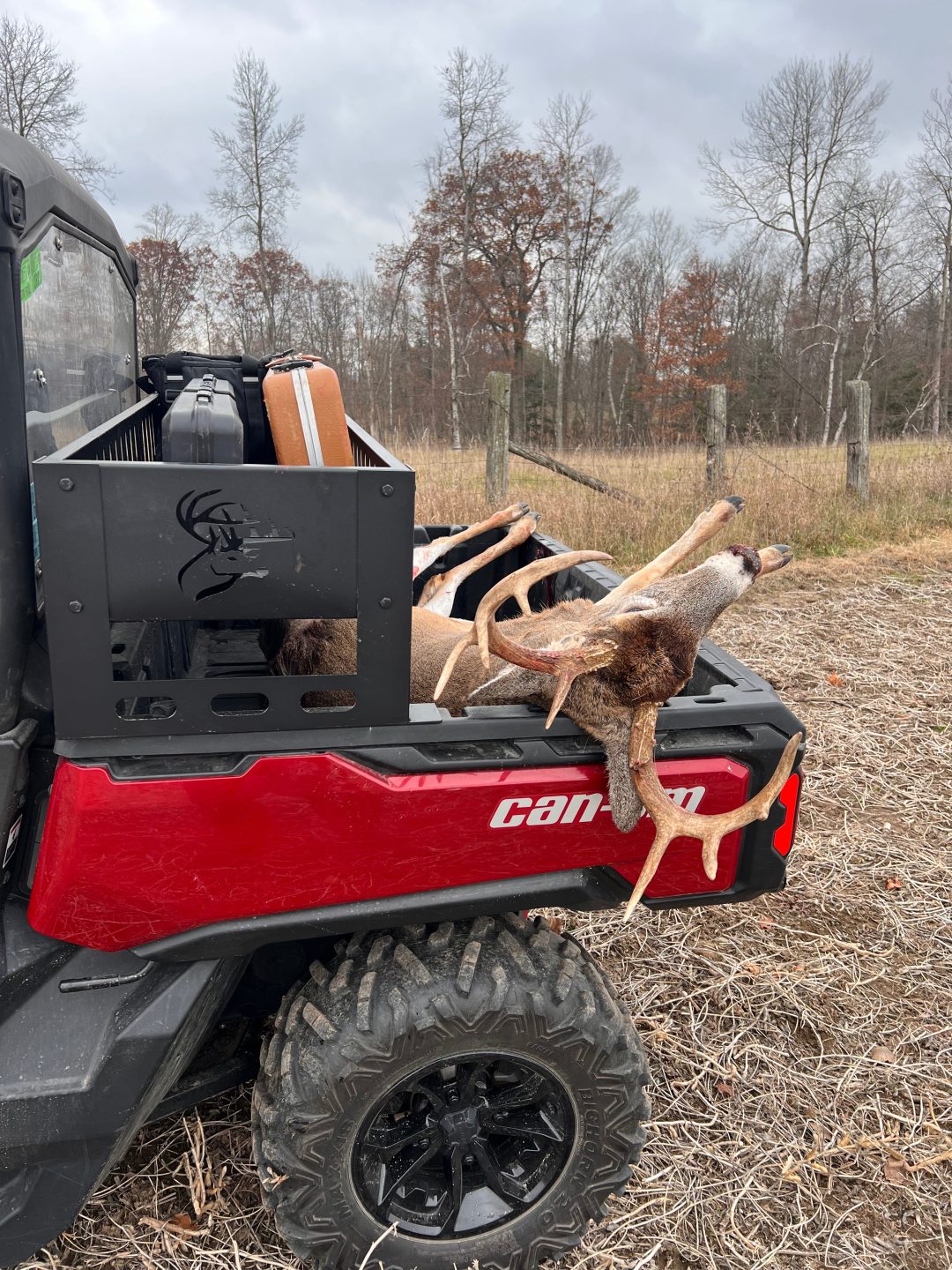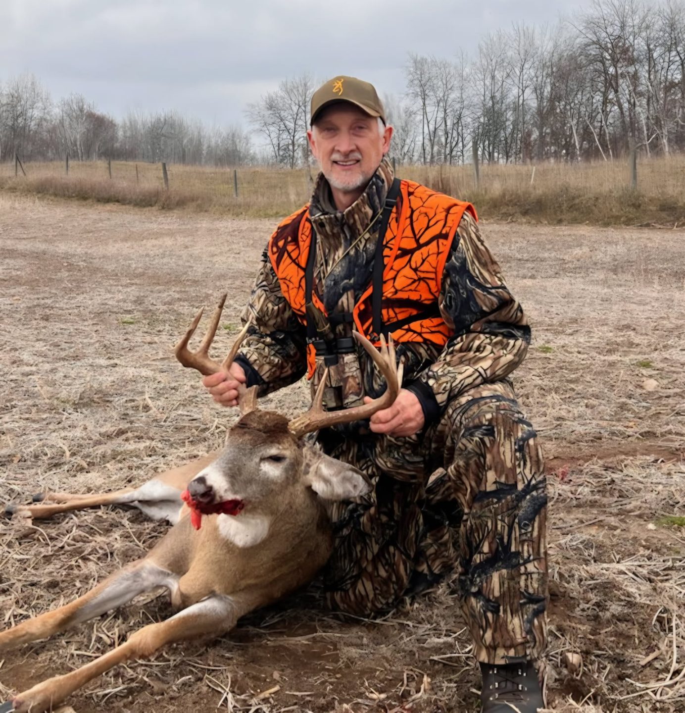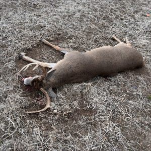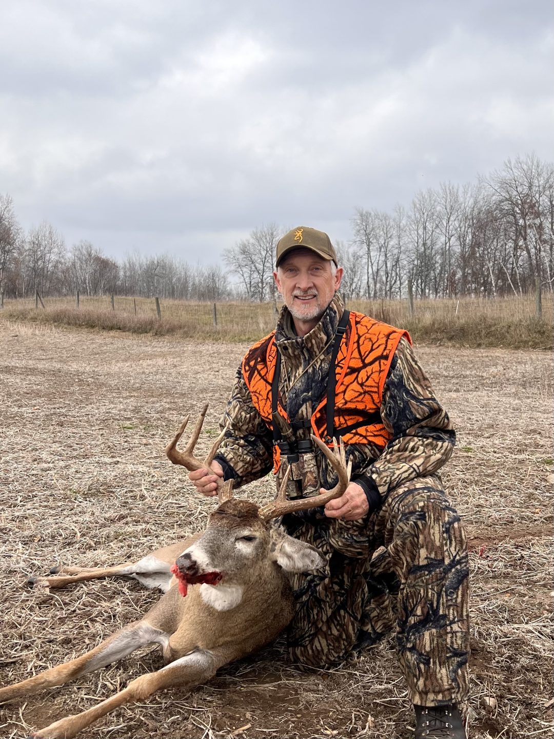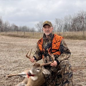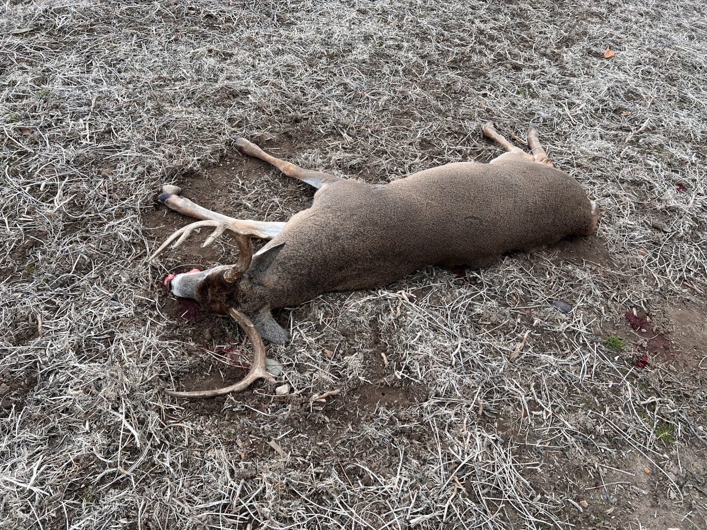 The Buck came out at 400 yards, crossing a bean stubble field with another buck. He got to 265 yards and stopped before jumping the fence and gave me a shot.