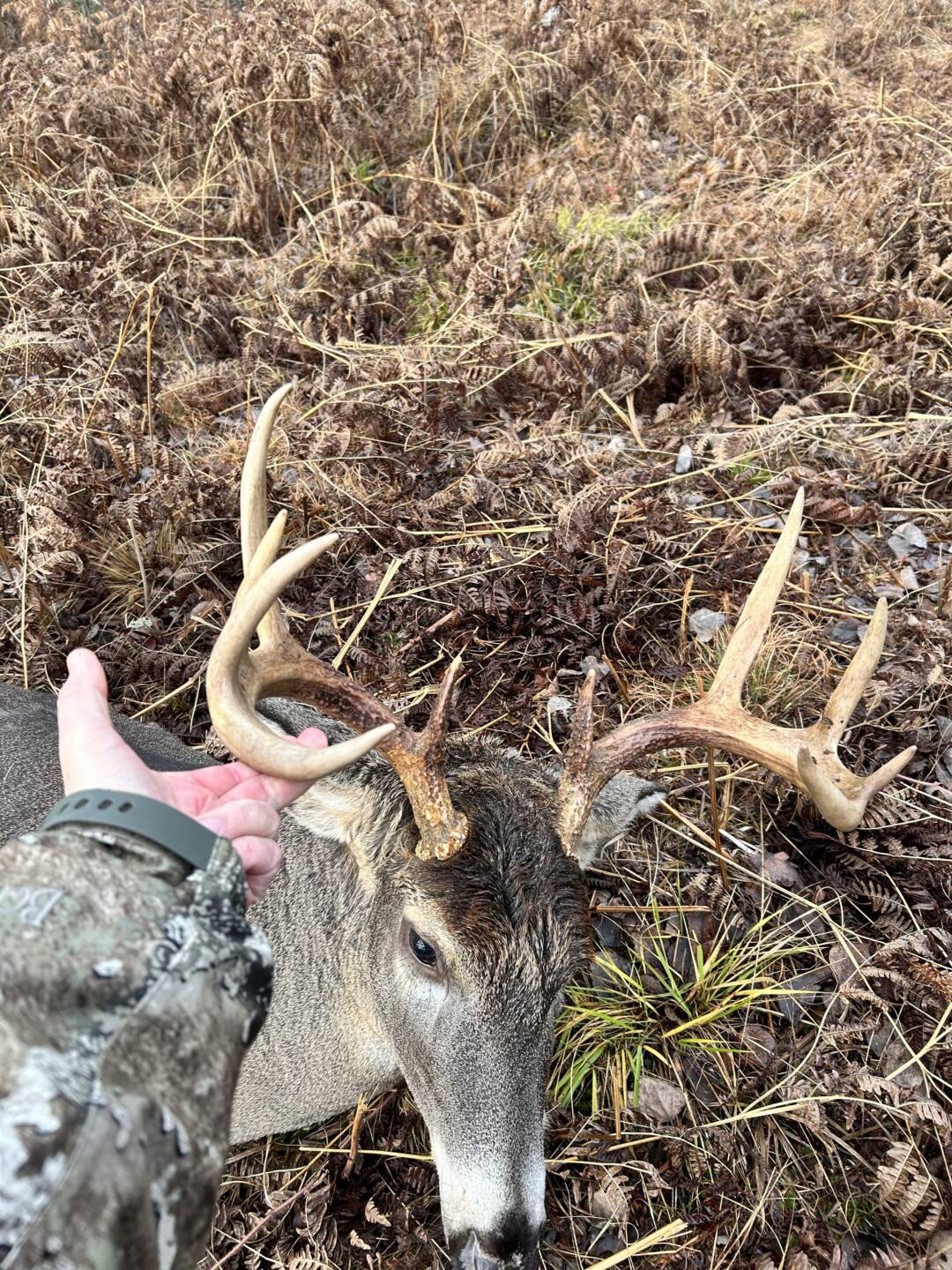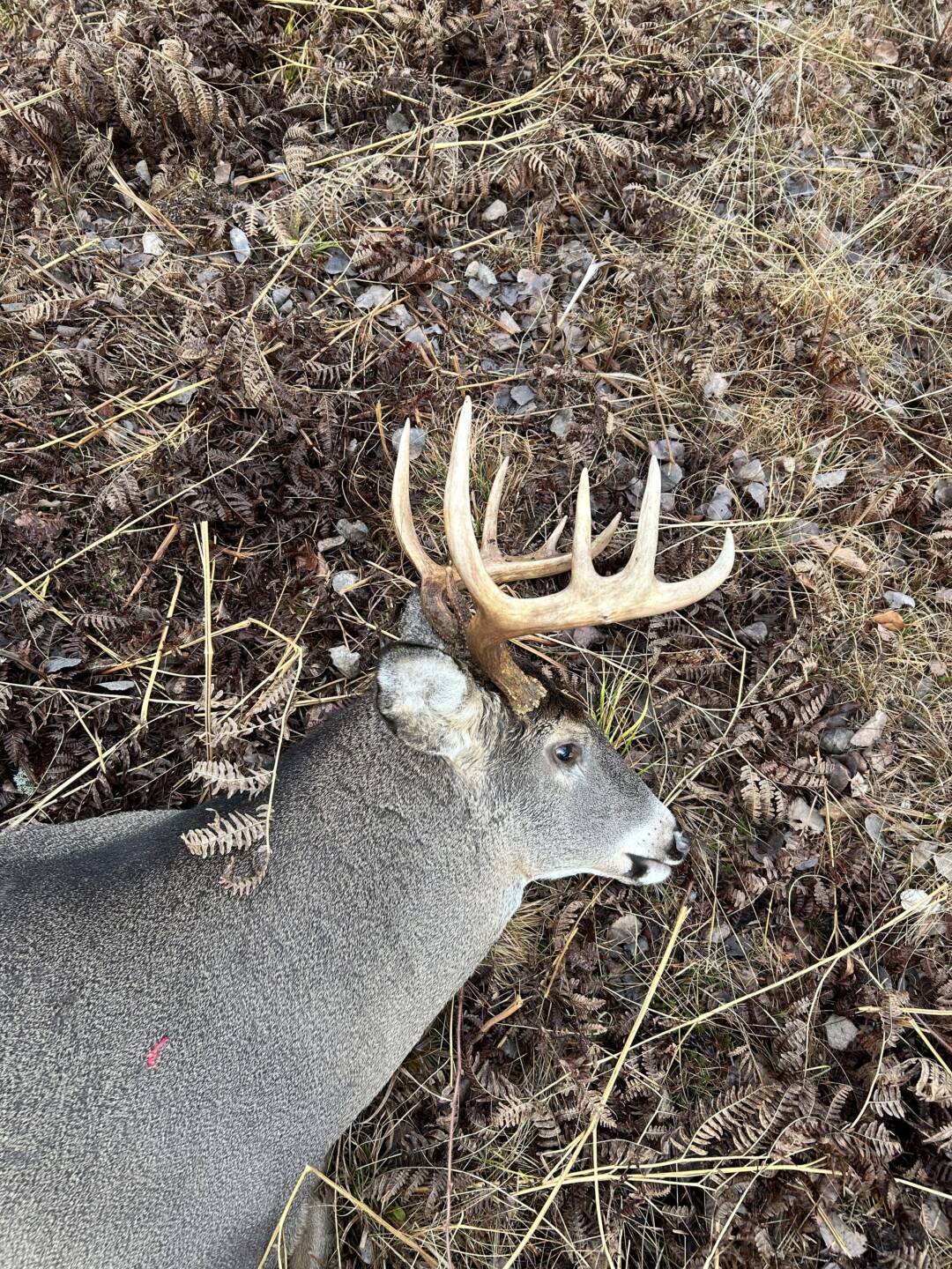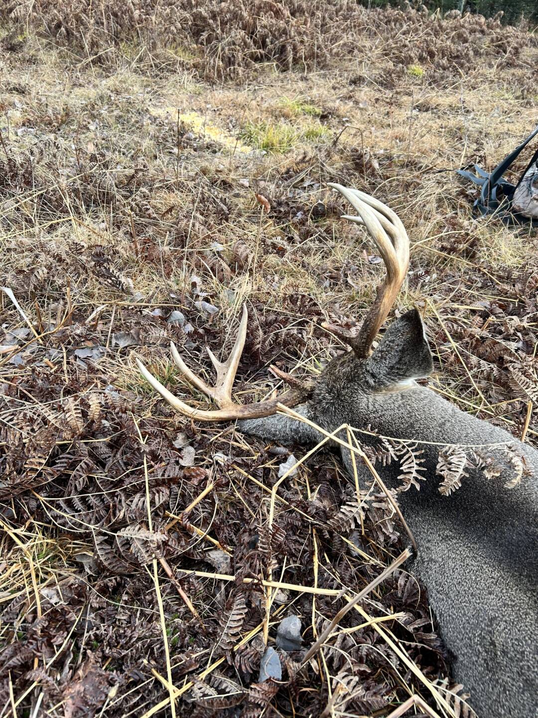 I had a doe about 30 yards in front of me looking at me and then over to my left with her ears forward. Over a 20 minute or so period she gradually looked further to my left and at me. I could not turn my head to see what was looking at because she was so close. (Ground blind). Eventually she was looking away from me when I saw a deer pop out to the left . It was a doe. She moved through to the right l. He came out behind her and then I saw his left side antler as he was quartering toward me. I saw his antler was outside his ears and pulled my rifle up and looked in my scope. I made a good shot as he dropped where he stood and did not move.