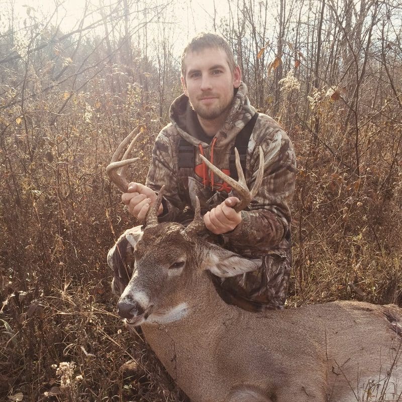 Watched this guy making a scrape and ripping up small trees in the field behind me hit two hard grunt calls and he charged right in. Shot at 40 yards slightly quartering away went about 50 yards great find by my father as my arrow stayed in the deer and we had no blood trail!