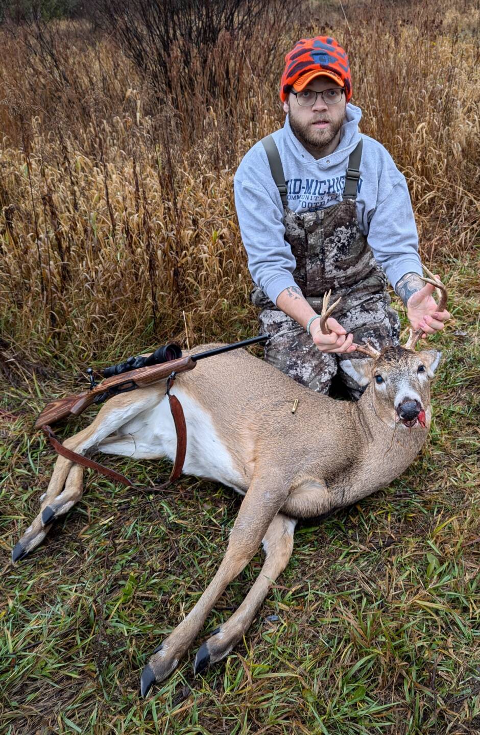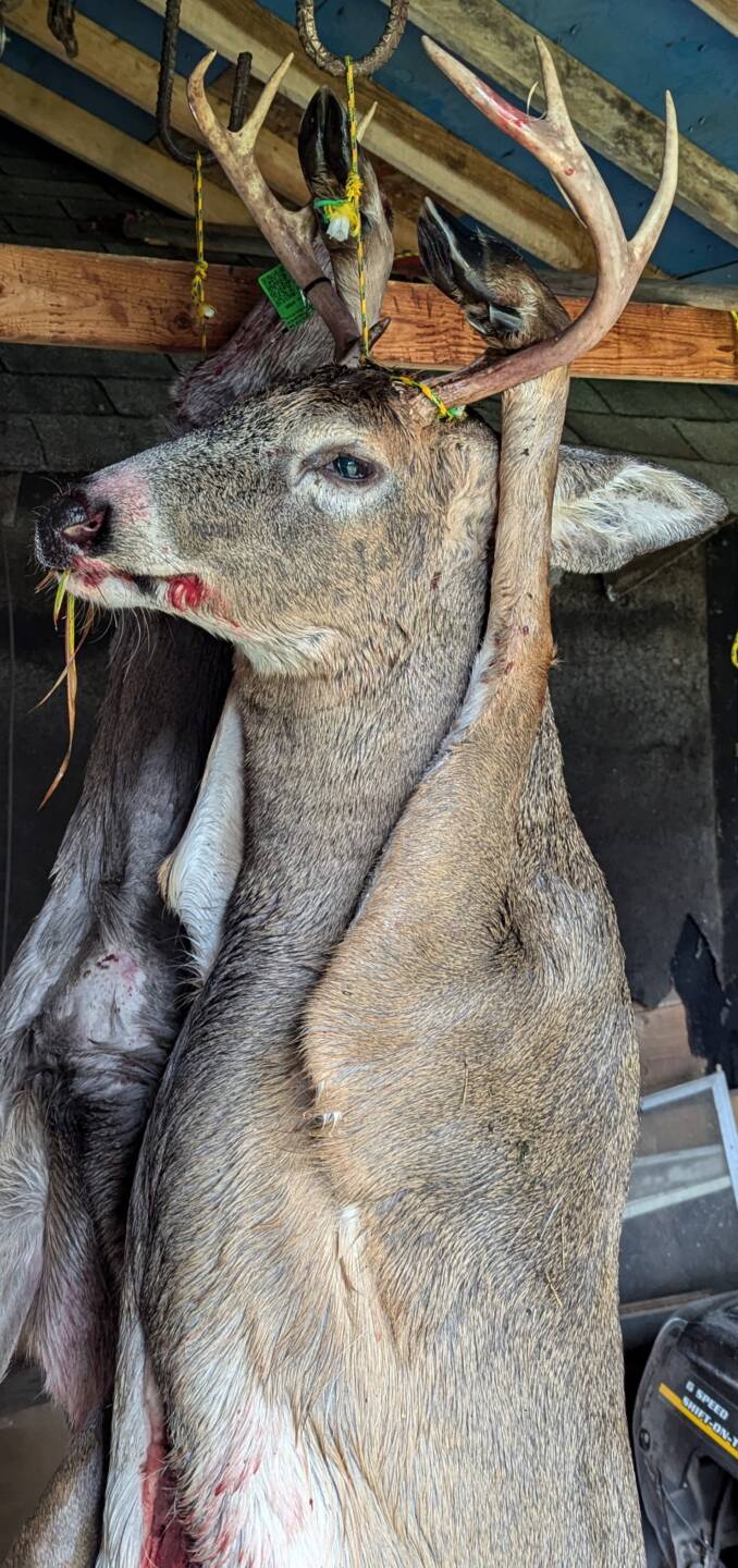 I had just put my gun out the of the blind window to make sure I had clearance, when my french toast (fiance) said do you see him? I said no, see what? She said the buck to your right. I was sitting on the right side of the blind and he was in my blind spot. Eventually he stepped to where I could see him and after stopping him twice, finally got the shot off. No blood or hair and feeling discouraged, we walked to where we last saw him and he was there, dead. My first buck, my first opening day deer. Been hunting a long time and I’m glad that I can finally cross a buck off.