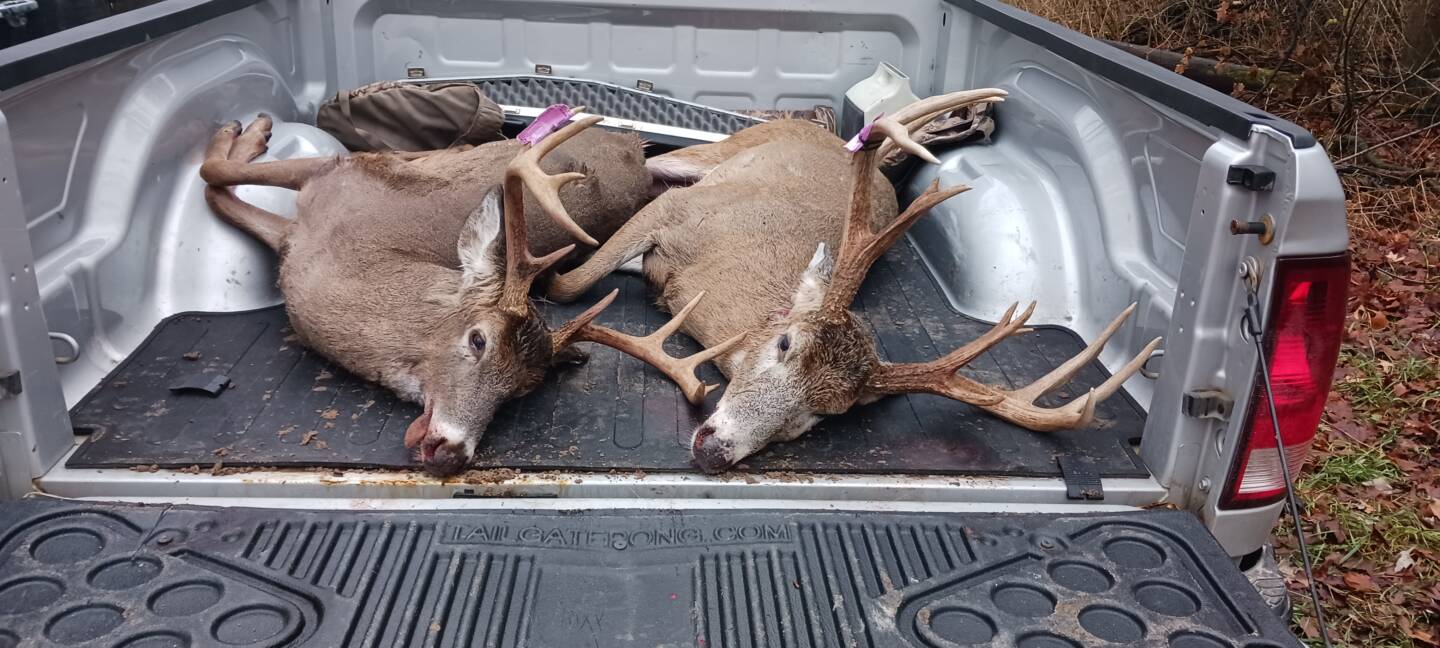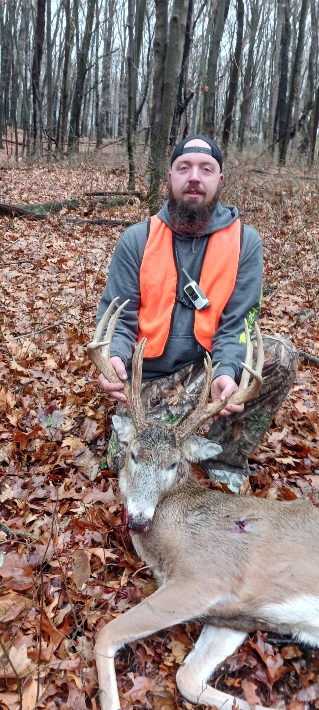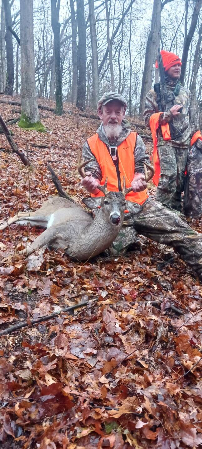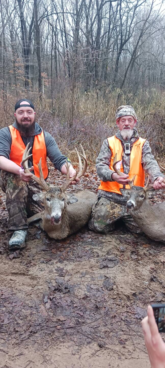Doing some deer drives my dad takes a really nice 10 first drive of the morning later that day this monster makes his way to the top of a ridge 150 yards out and gives me a shot dropped him open sights took me a minute to get over to him he tried to get back up I had to put another 1 in him what a day father son double up state land bucks