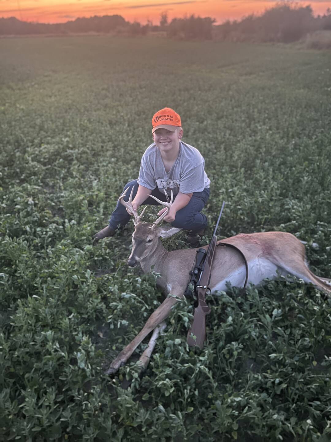 I saw him walk out of the woods in the field and then he picked his head up and I said “I’ll shoot that one!” And then I waited for him to come out and get broadside and I took my shot and dropped him.