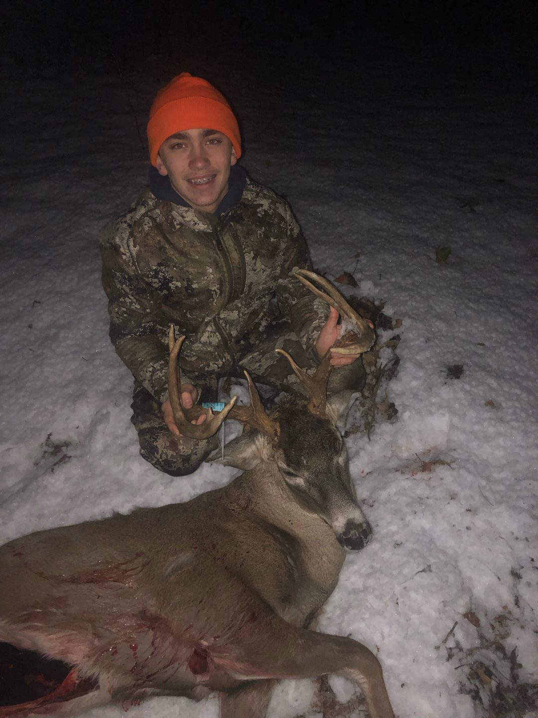 Saw 8 yearlings come in running. Then there was about 10 does running in, I thought there might be a buck chasing so I waited and then he showed up. Shot him once then he ran and stopped and hit him again. Tracked him for about 300 yards and then found him.