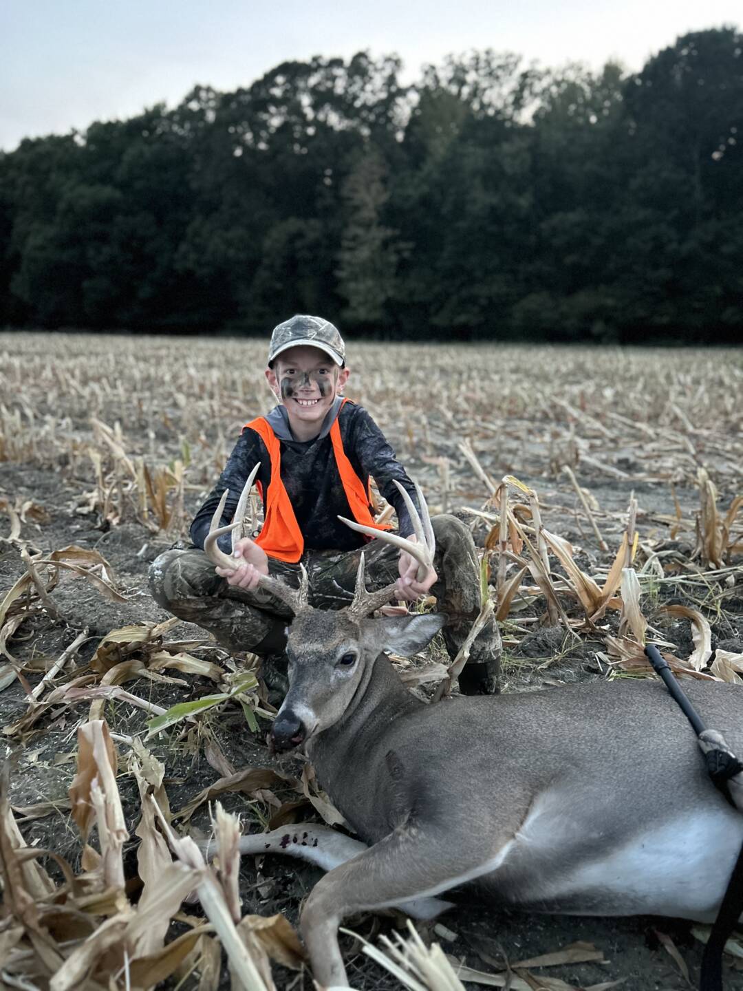 Easton shot this buck on our family farm over the youth hunt weekend. After hunting from a blind in the morning, Easton decided he wanted to make a makeshift corn blind closer to where the deer were. So, we spent some time at lunchtime making cover in some corn that the farmer missed. We sat 3 hours in the evening, mostly with does and fawns around us. Easton stayed very still, and let his .350 do the talking. His 3rd buck, and his biggest buck.